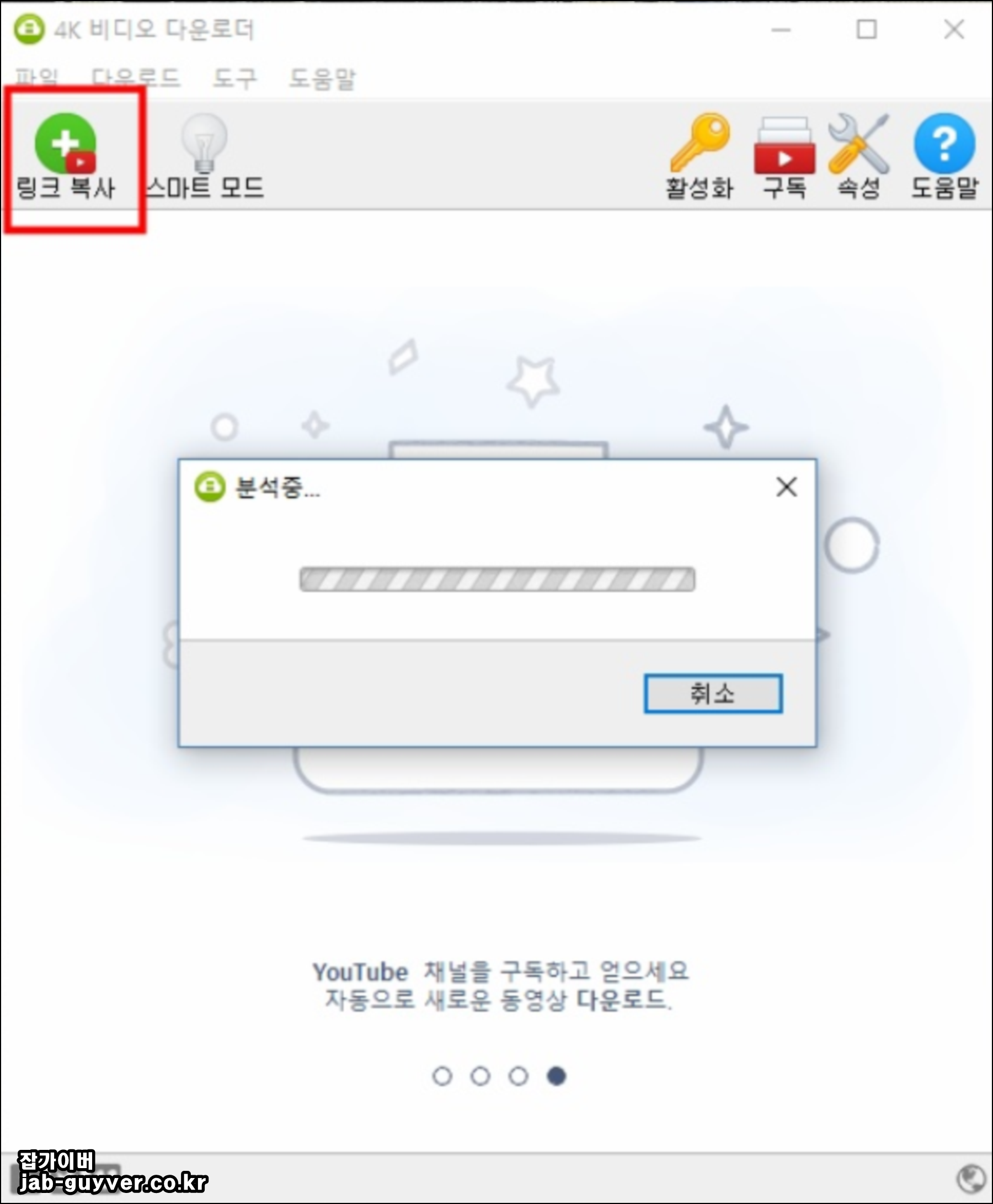 - 화면에서 보이는 링크 복사라는 버튼을 누르면 자동으로 아까 유튜브 주소를 복사한것을 자동으로 인식하여 다운로드 창이 진행됩니다.