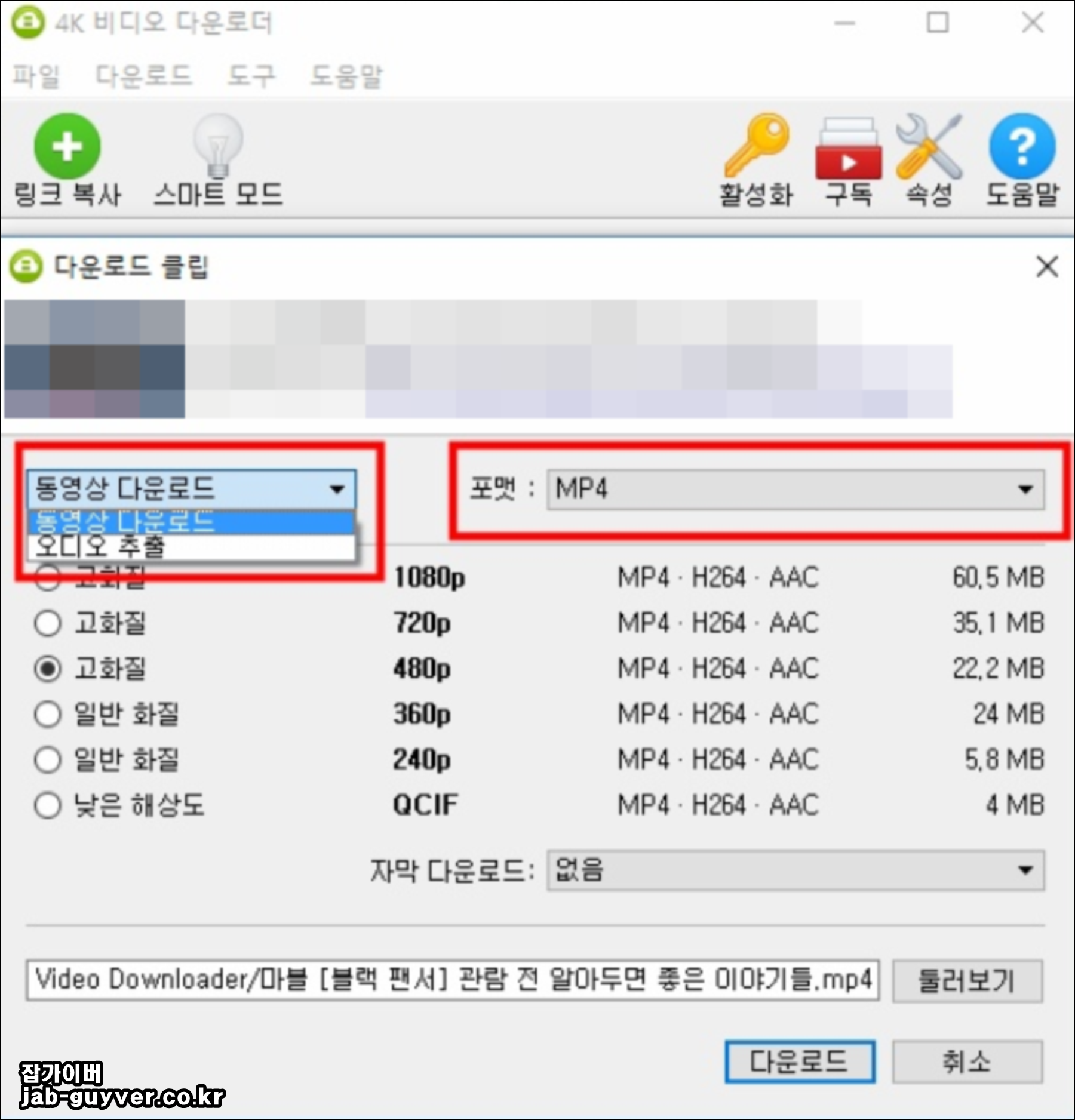 - 아니면 오디오만 추출할 것인지 선택을 해주시고 자신이 원하는 포맷 타입과 영상 화실을 선택을 해줍니다
