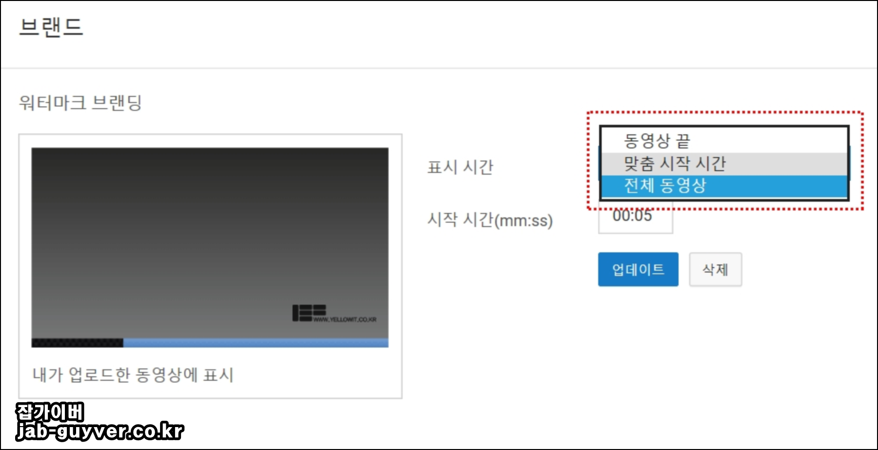 워터마크 브랜딩을 통해 유튜브 동영상에 로고를 삽입해서 오버레이할 수 있습니다.