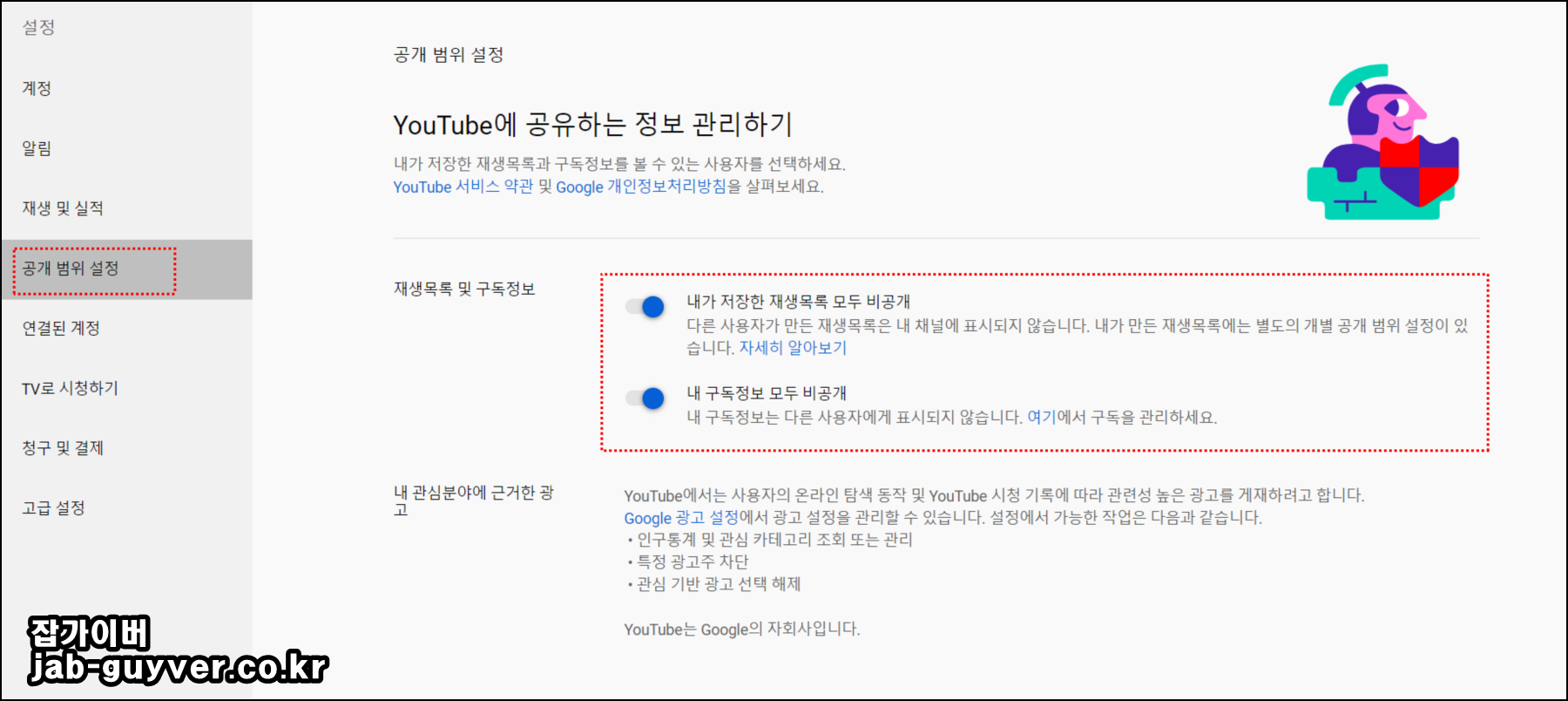 그럼 자신의 유튜브 계정의 공개범위 설정이 가능합니다.