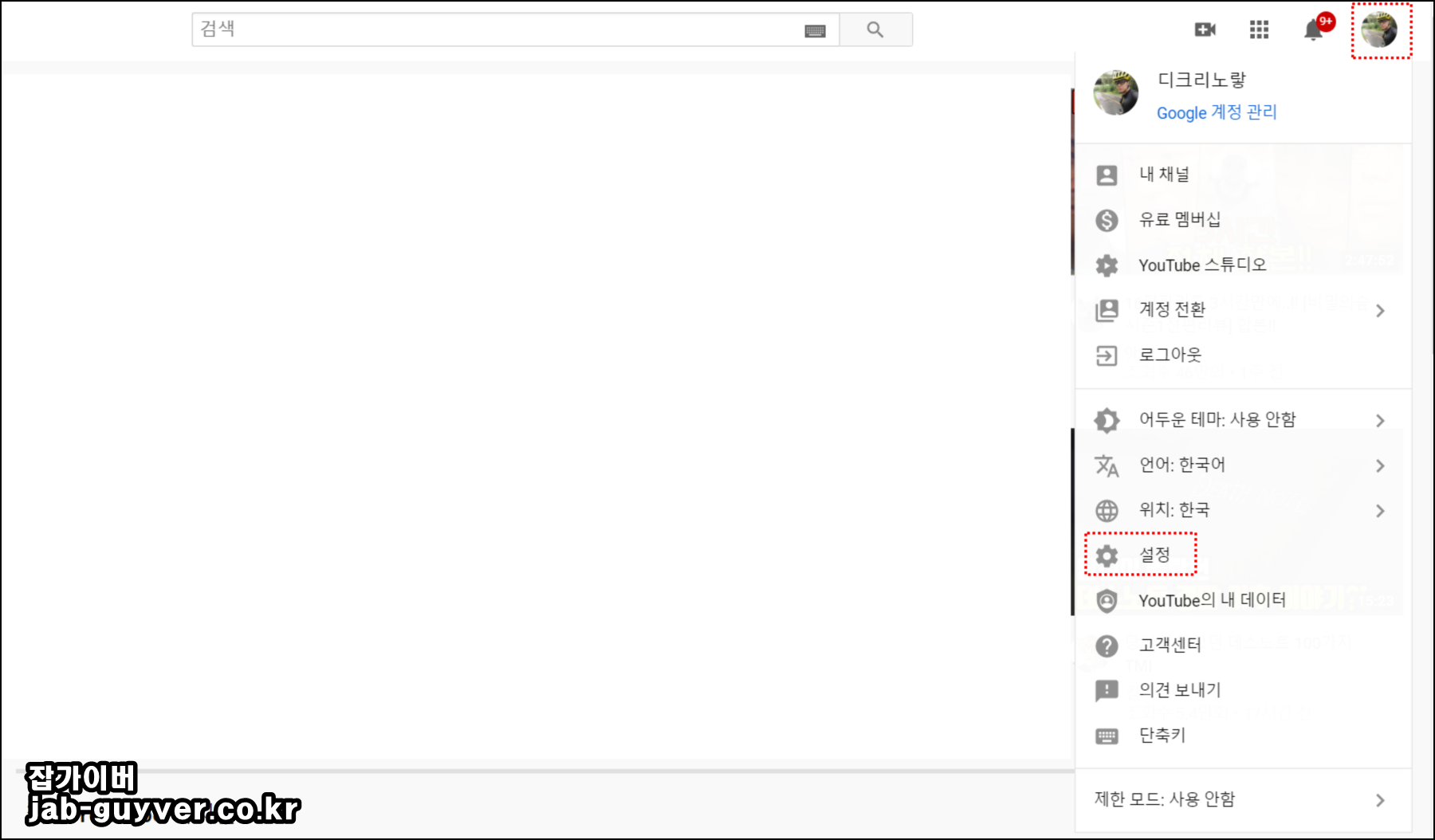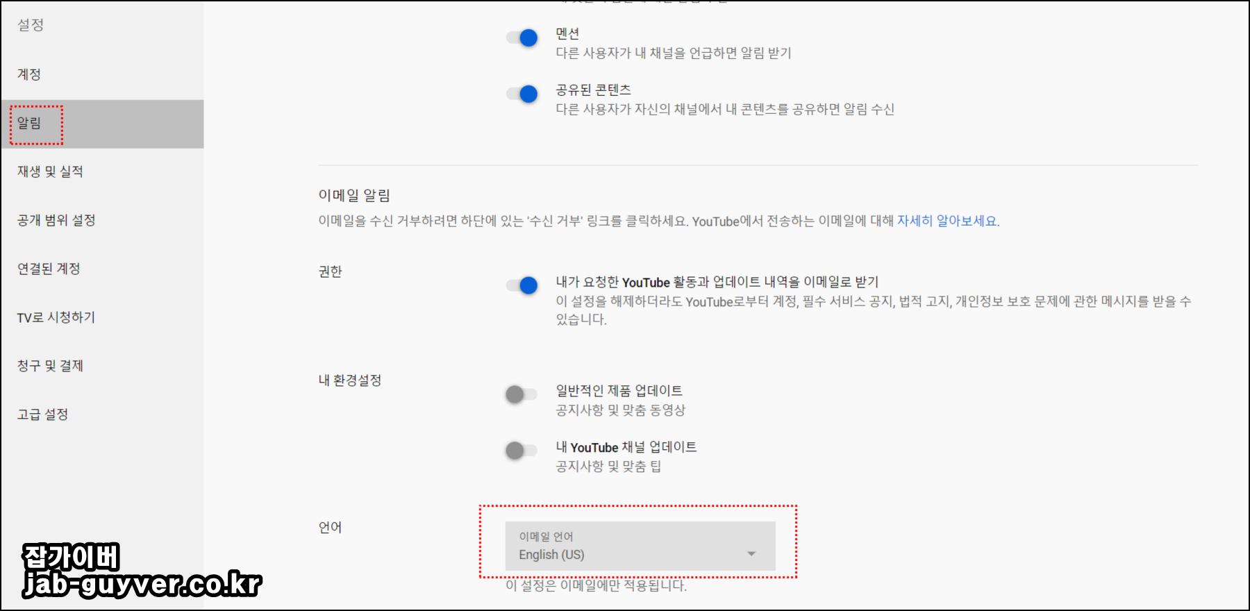 그외에 유튜브로 부터 전송되는 메일이 영어로 뜨는 경우 알림 -> 언어를 영어에서 한글로 변경하면 메일이 한글로 전송됩니다.