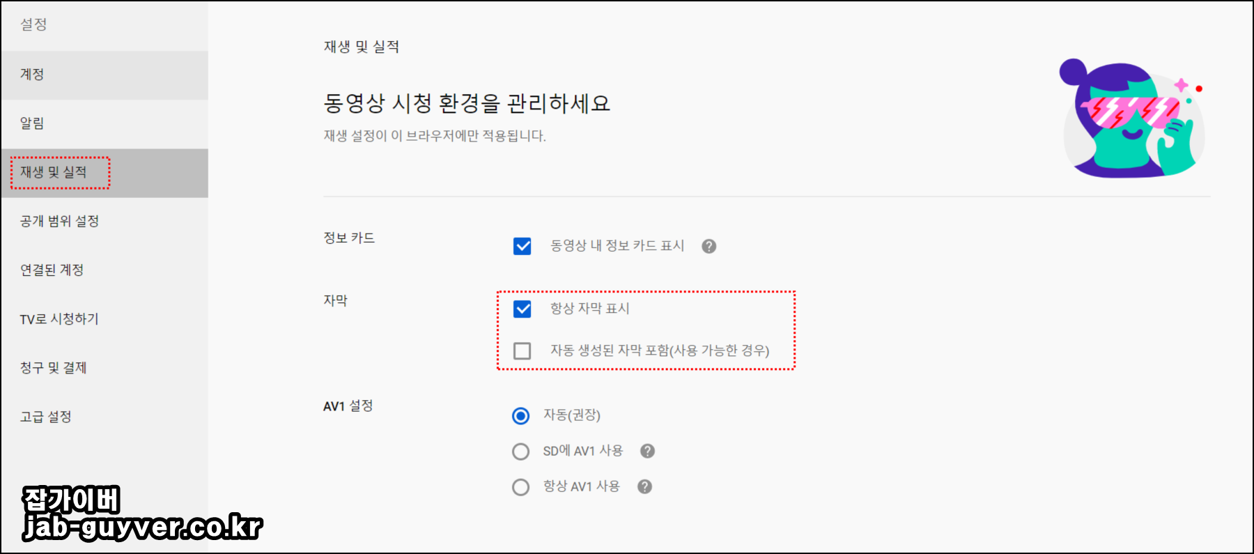 유튜브에서 재생되는 자막 또한 항상 자막이 표시되도록 설정할 수 있습니다.