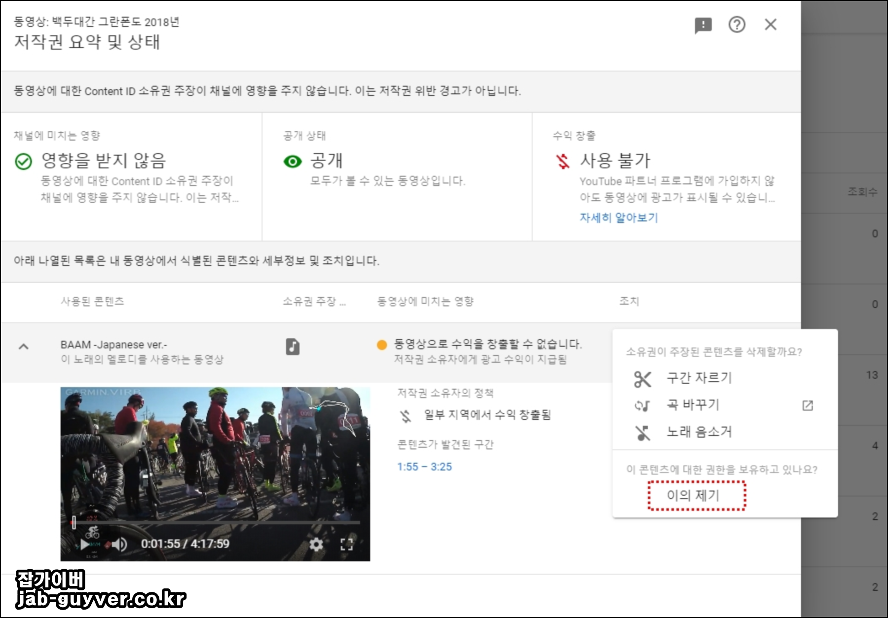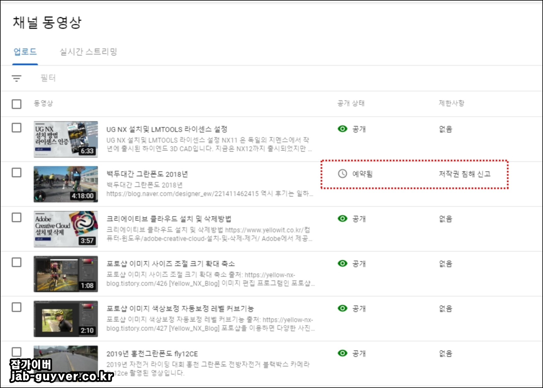 제 유튜브 영상을 보면 제가 업로드한 백두대간 그란폰도에 대해 저작권 침해 신고가 들어와 있습니다.
