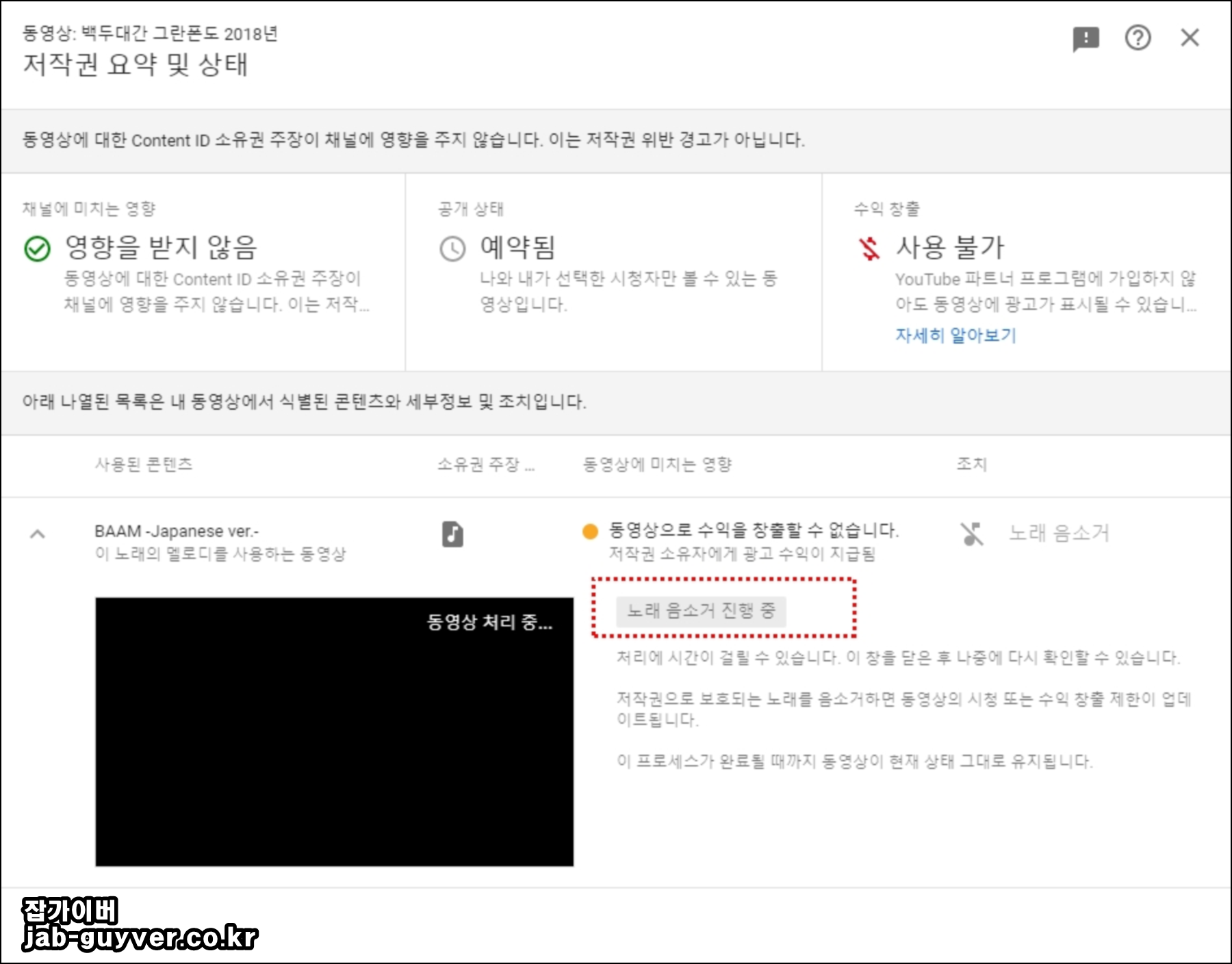 현재 영상에 대한 음악이 Baam-Japanese ver 에 대해 저작권 침해가 된것으로 보입니다.
