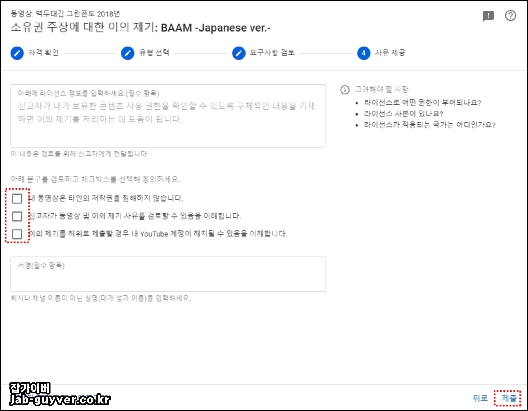마지막으로 동영상 저작권 침해하지 않았다는 서명 및 체크를 하고 제출을 합니다.