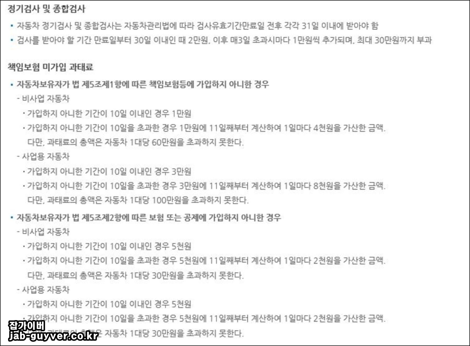 특히 정기적인 자동차 정비를 소홀히 하면 자신은 물론 타인의 생명과 안전에도 큰 위협이 될 수 있습니다. 이 때문에 꾸준히 자동차 정기검사를 받아야 하며, 이를 소홀히 할 경우 과태료가 부과될 수 있습니다.