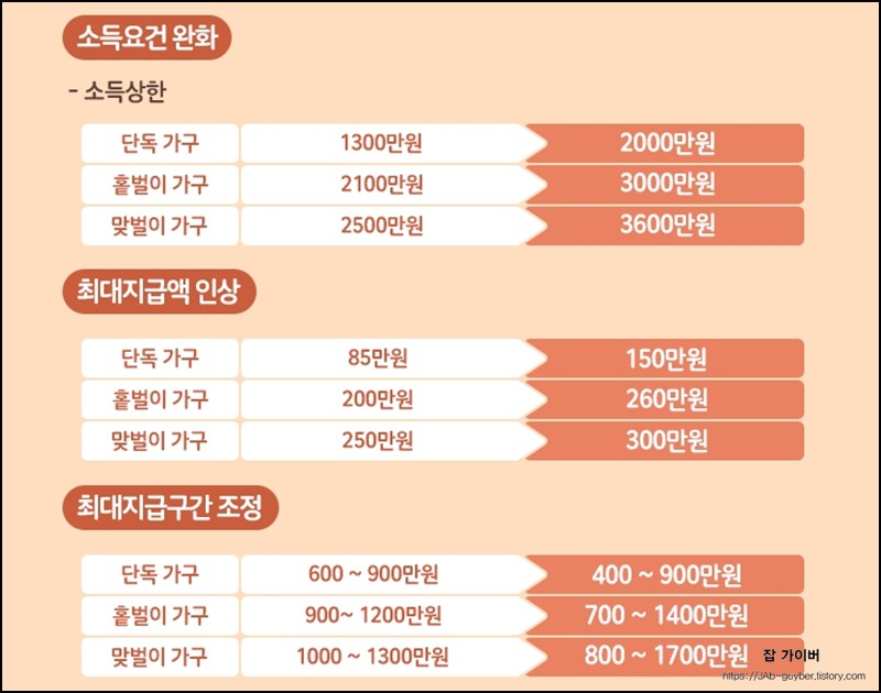 - 현행 1.4억 원 미만에서 2억 원으로 완화했으며 1억 원 이상시 지급액 50% 감액에서 1.4억 원 이상으로 변경