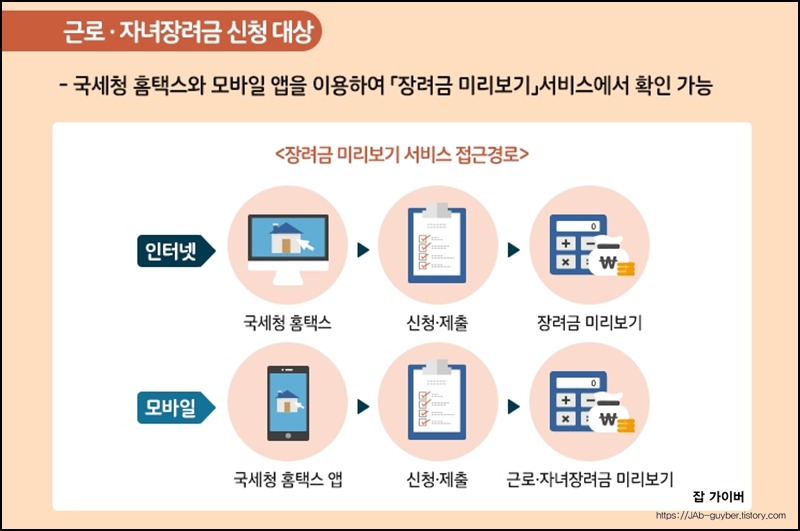 국세청 홈택스와 모바일 액을 이용해 장려금 미리 보기 서비스에서 확인이 가능합니다.