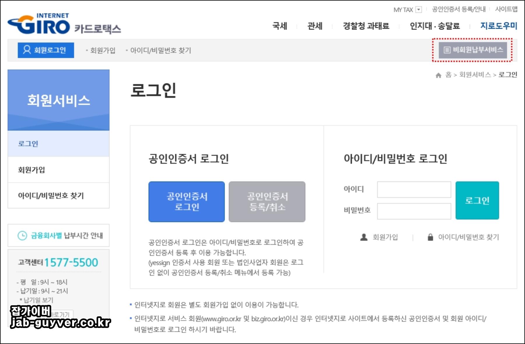 비회원으로 납부방법은 간단하며 홈페이지 로그인 부분에서 우측 상단의 비회원납부서비스 선택합니다.