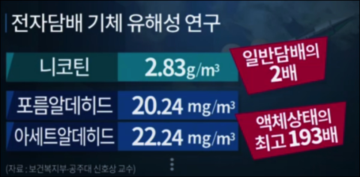 전자담배에 들어있는 니코틴, 포름알데히드 아세트 할 데이트 등 독성물질 10개 이상이 혼합되어있다고 합니다.