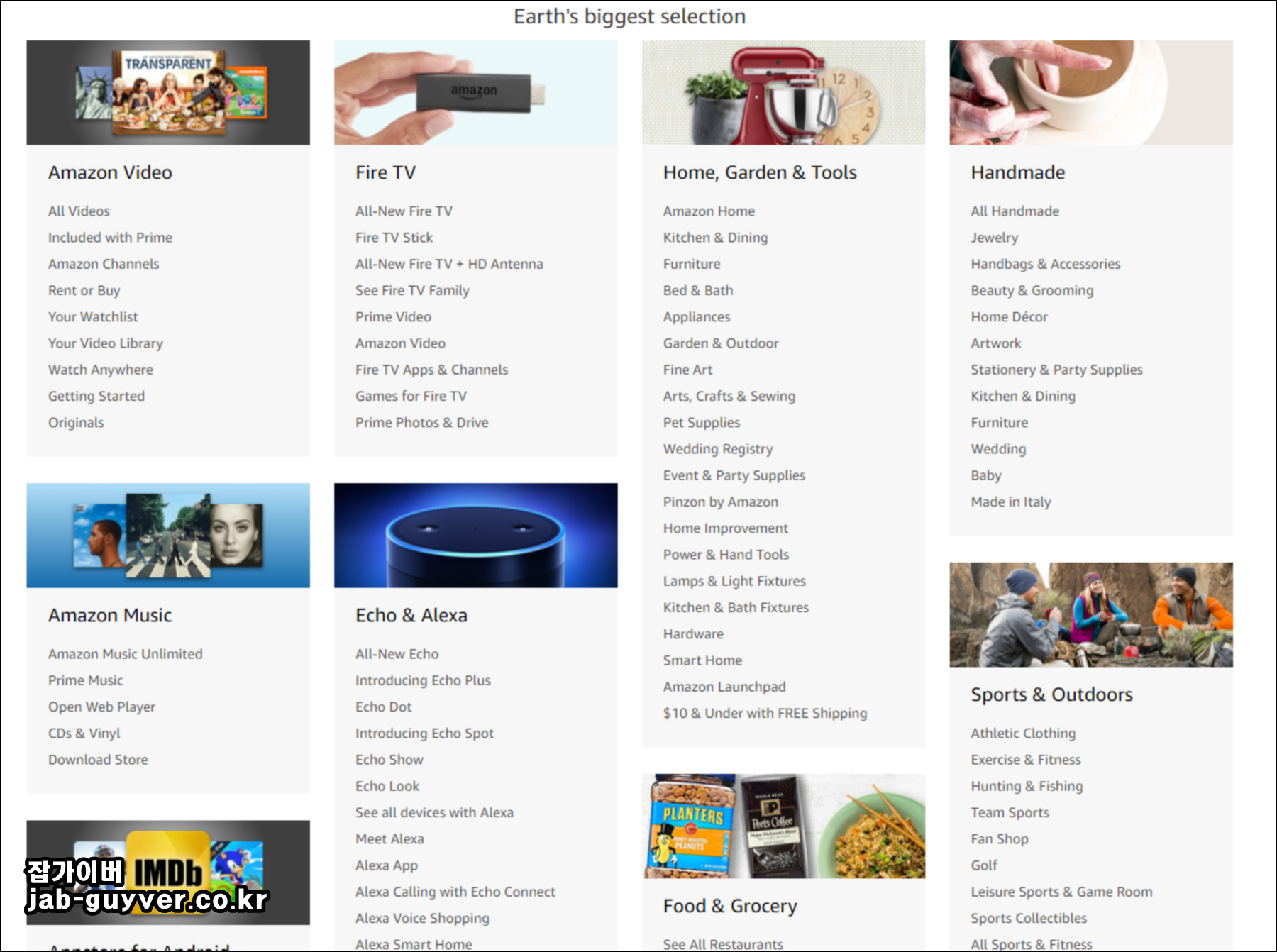 이제 원하는 쇼핑을 하기 위해서 구입하고 싶은 제품의 이름을 검색하거나 카테고리를 선택해 쇼핑이 가능하며 카테고리를 선택하게 되면 다양한 아마존에서 지원하는 쇼핑 카테고리가 분류됩니다.