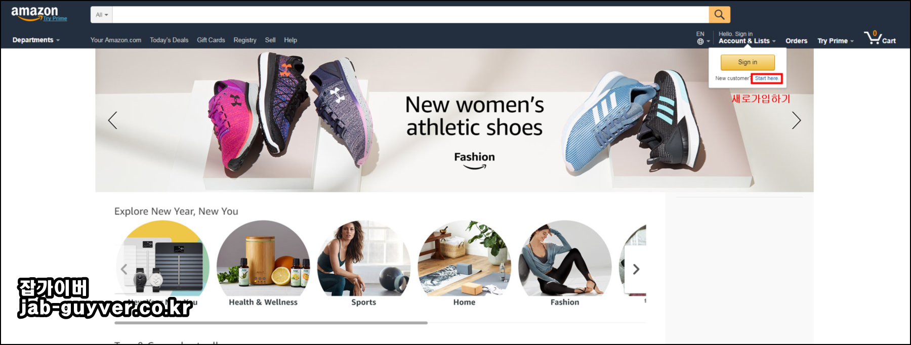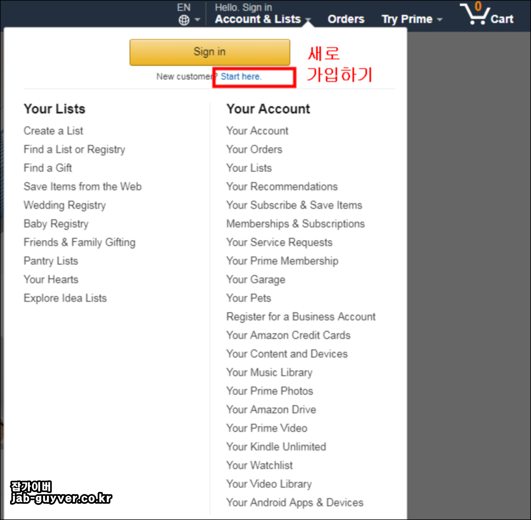 - 우측 상단에 보이는 아이콘을 선택해 아마존 가입을 위해서 Sign 마우스를 갖다 대면Start Here을 클릭 후 정보를 입력해줍니다.