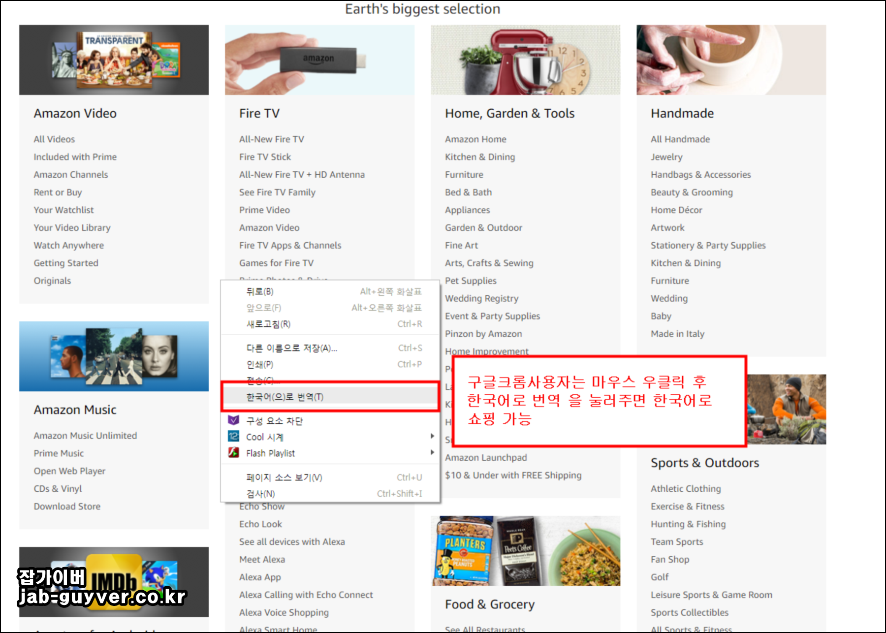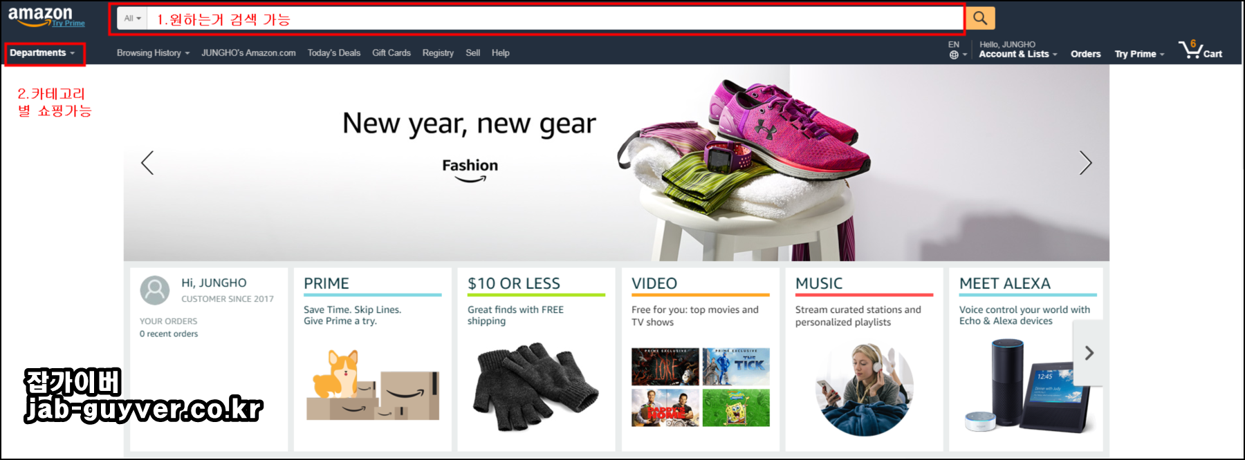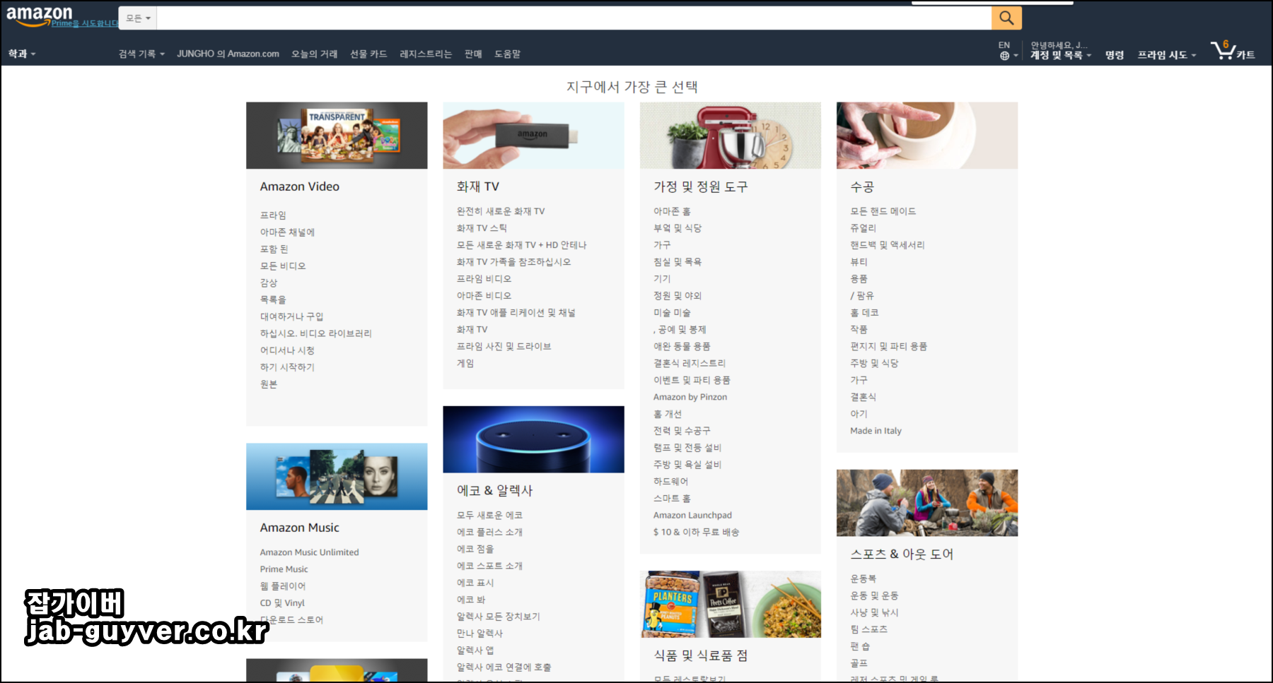 이제 원하는 쇼핑을 하기 위해서 구입하고 싶은 제품의 이름을 검색하거나 카테고리를 선택해 쇼핑이 가능하며 카테고리를 선택하게 되면 다양한 아마존에서 지원하는 쇼핑 카테고리가 분류됩니다.
