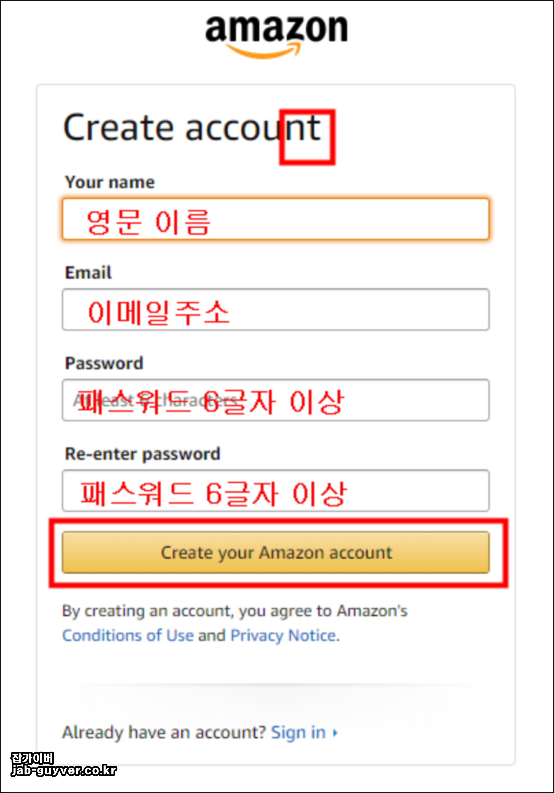 - 아마존의 가입정보는 많은 정보를 요구하지 않으며 영문으로 된 자신의 이름과이메일 주소 그리고 패스워드 6글자 이상으로 지정하고 가입합니다.