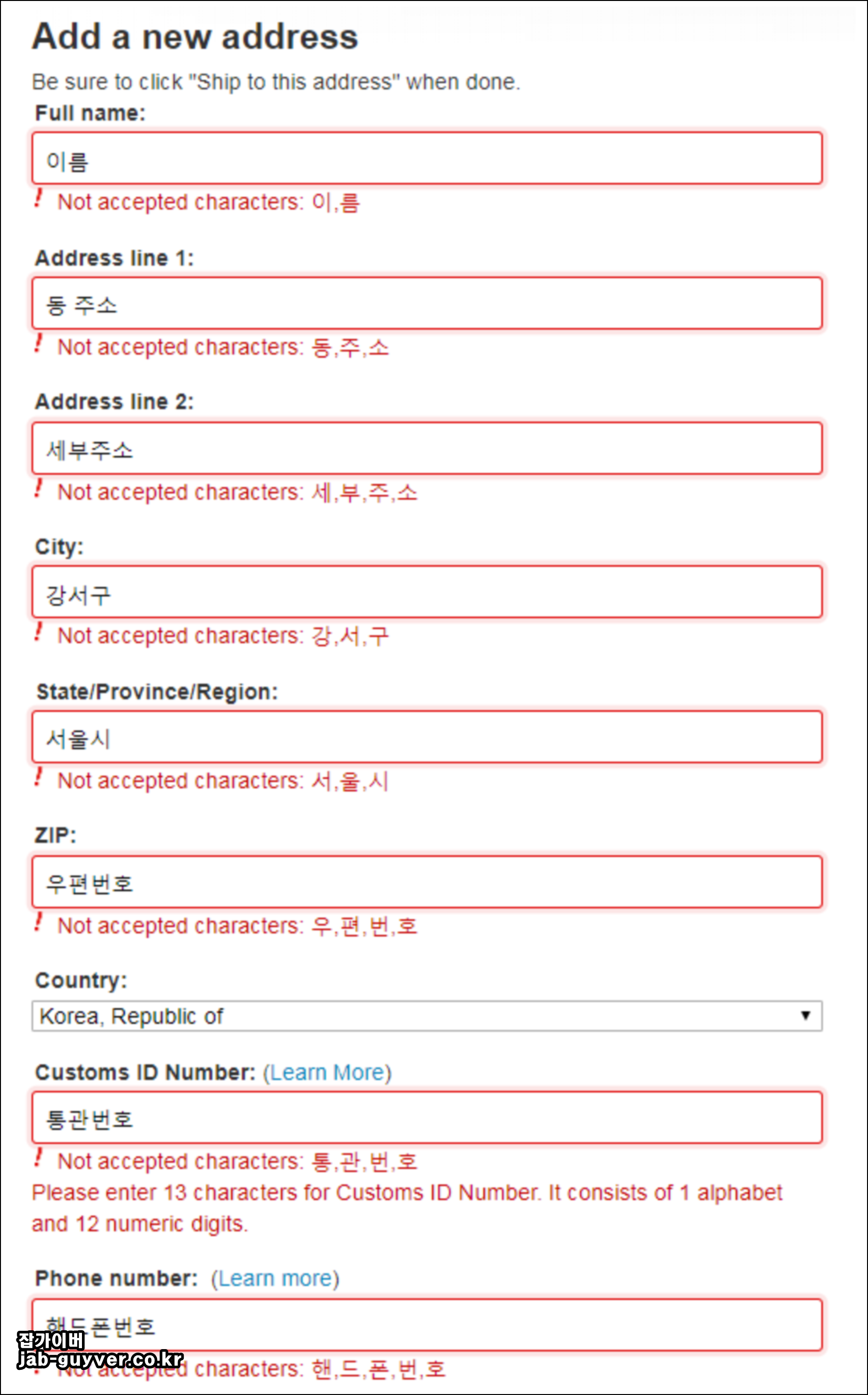 구매를 하게 되면 드디어 제품을 배송받게 될 자세한 정보를 요구하며 보는 것과 같이 각각에 대한 항목을 입력해줍니다.