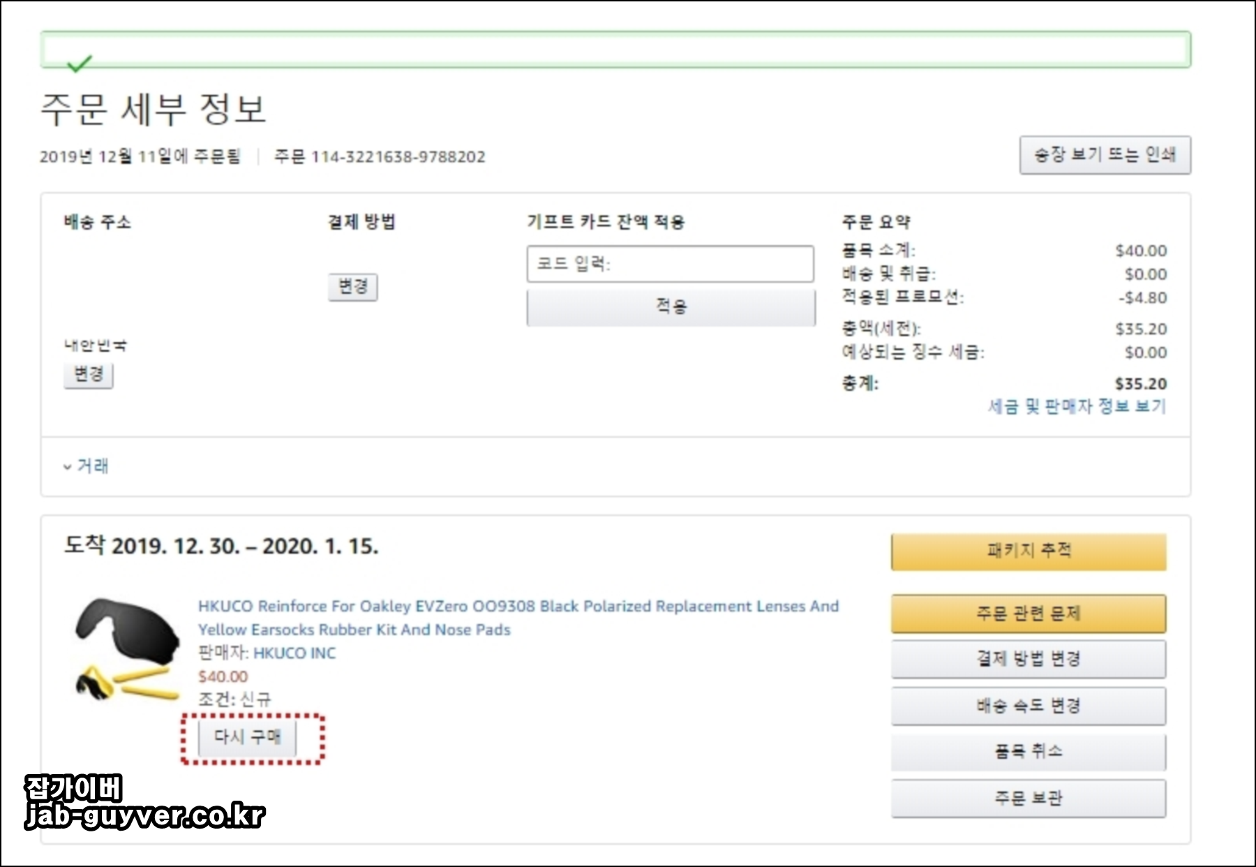 이후 주문 세부정보에서 다시구매버튼을 눌러 재구입을 합니다.