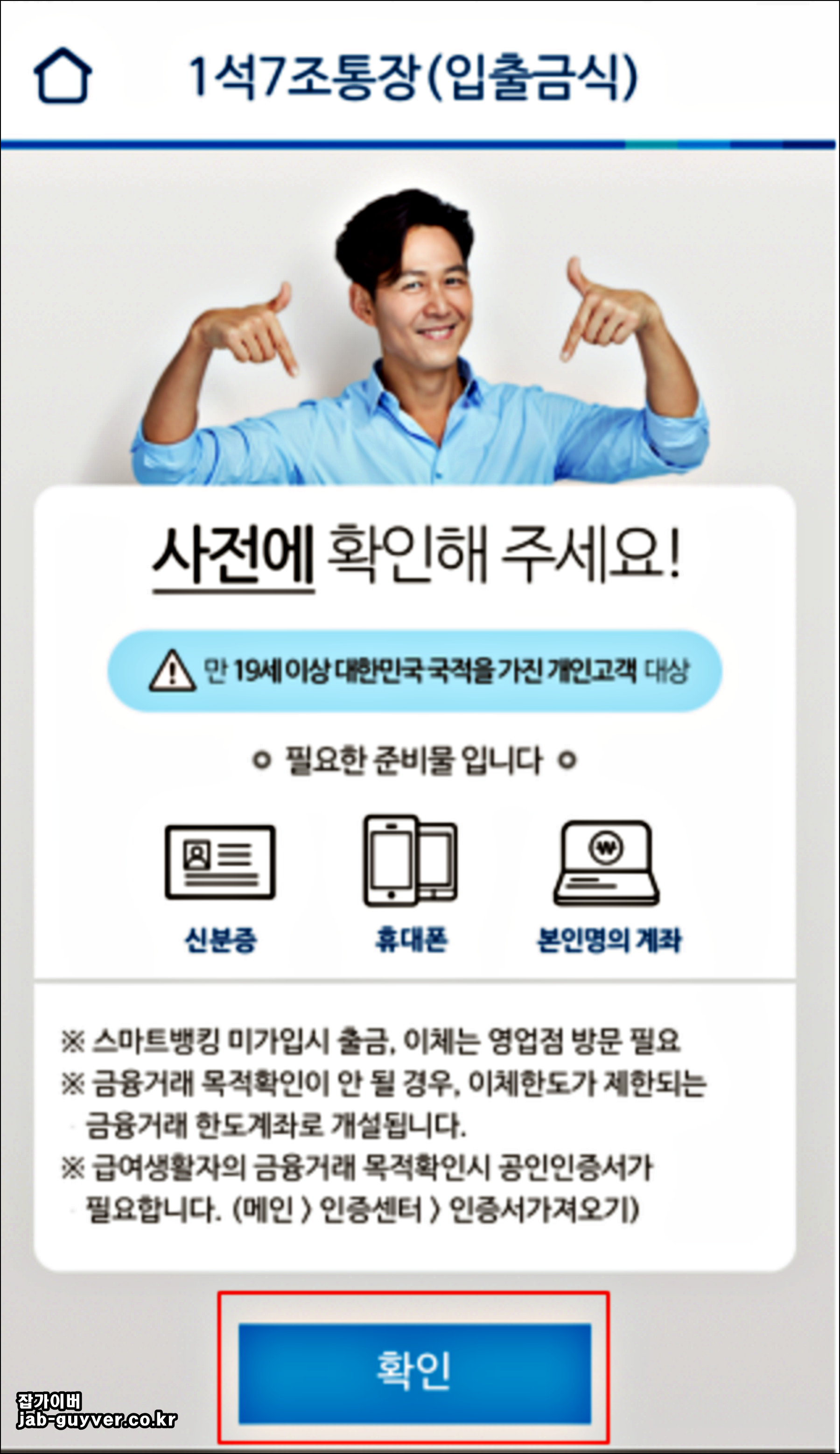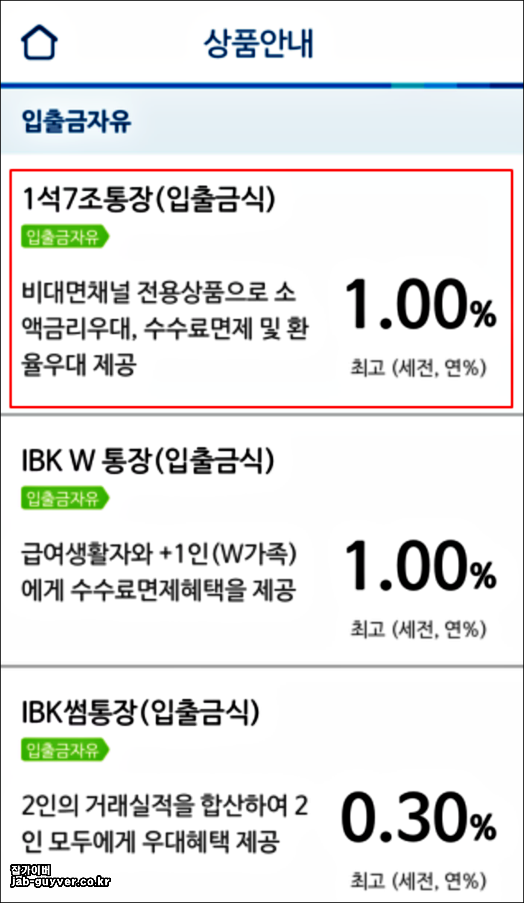 2. 그중에서 1석 7조 통장 (입출금식) "비대면 채널 전용상품으로 소액 금리우대, 수수료 면제 및 환율우대 제공"을 클릭해줍니다.