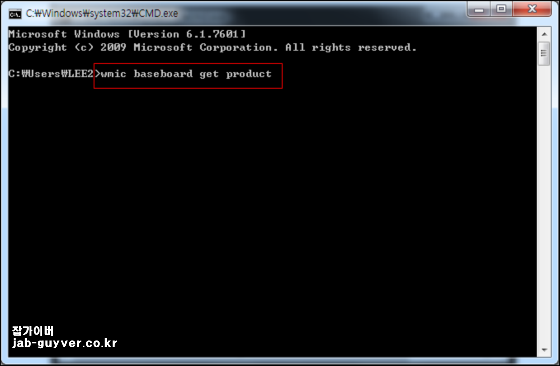 실행된 CMD 창에 메인보드를 확인할 수 있는 명령어인 "wmic baseboard get product"라고 입력합니다.