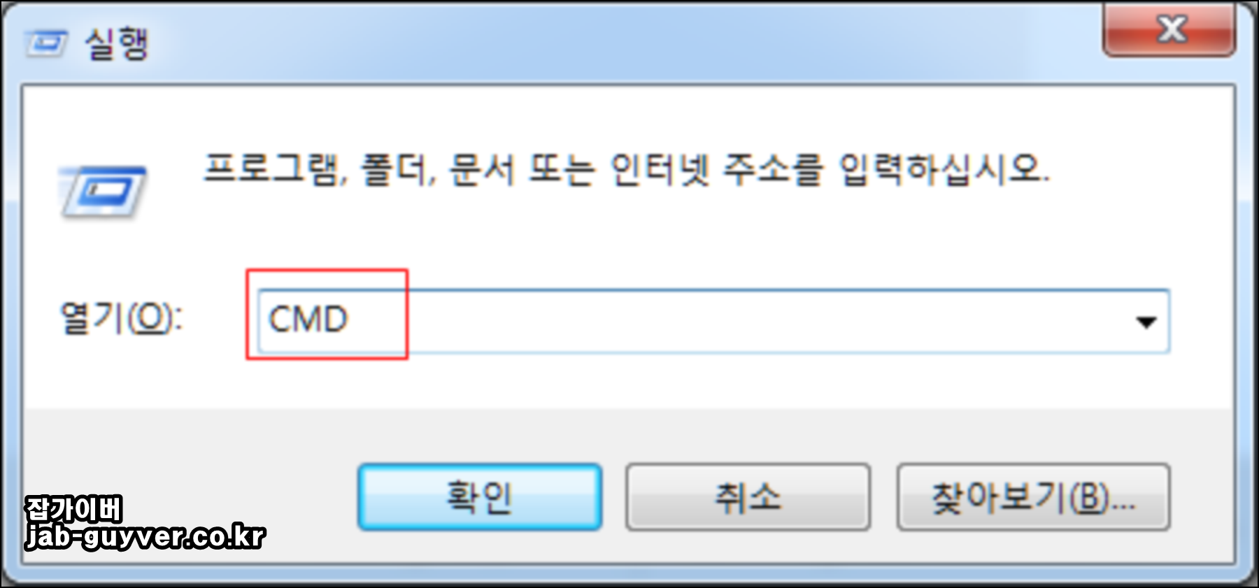 - 실행된 실행창에 CMD라고 입력 후 확인을 눌러 도스 창으로 들어갑니다.