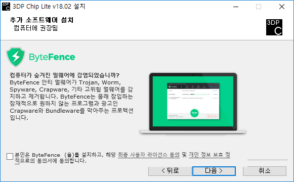 설치시 백신 및 멀웨어 탐지기가 설치를 권장하지만 윈도우디펜더 및 실시간보호가 윈도우에서 자동 제공되기 때문에 설치를 취소합니다.