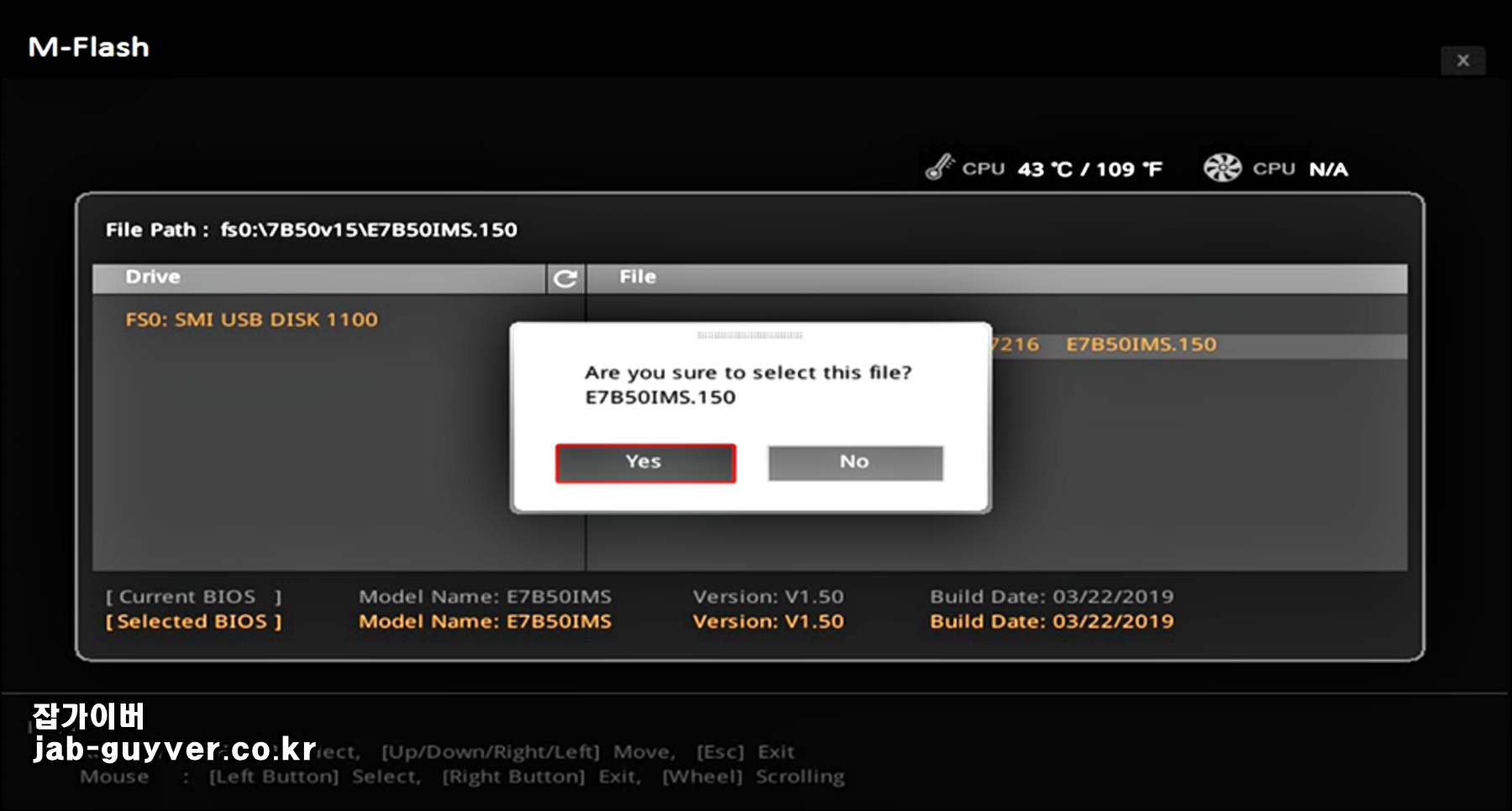YES를 선택하면 MSI 바이오스 업데이트가 진행되며 업데이트 중에는 컴퓨터를 종료하거나 USB를 제거하면 안 됩니다.