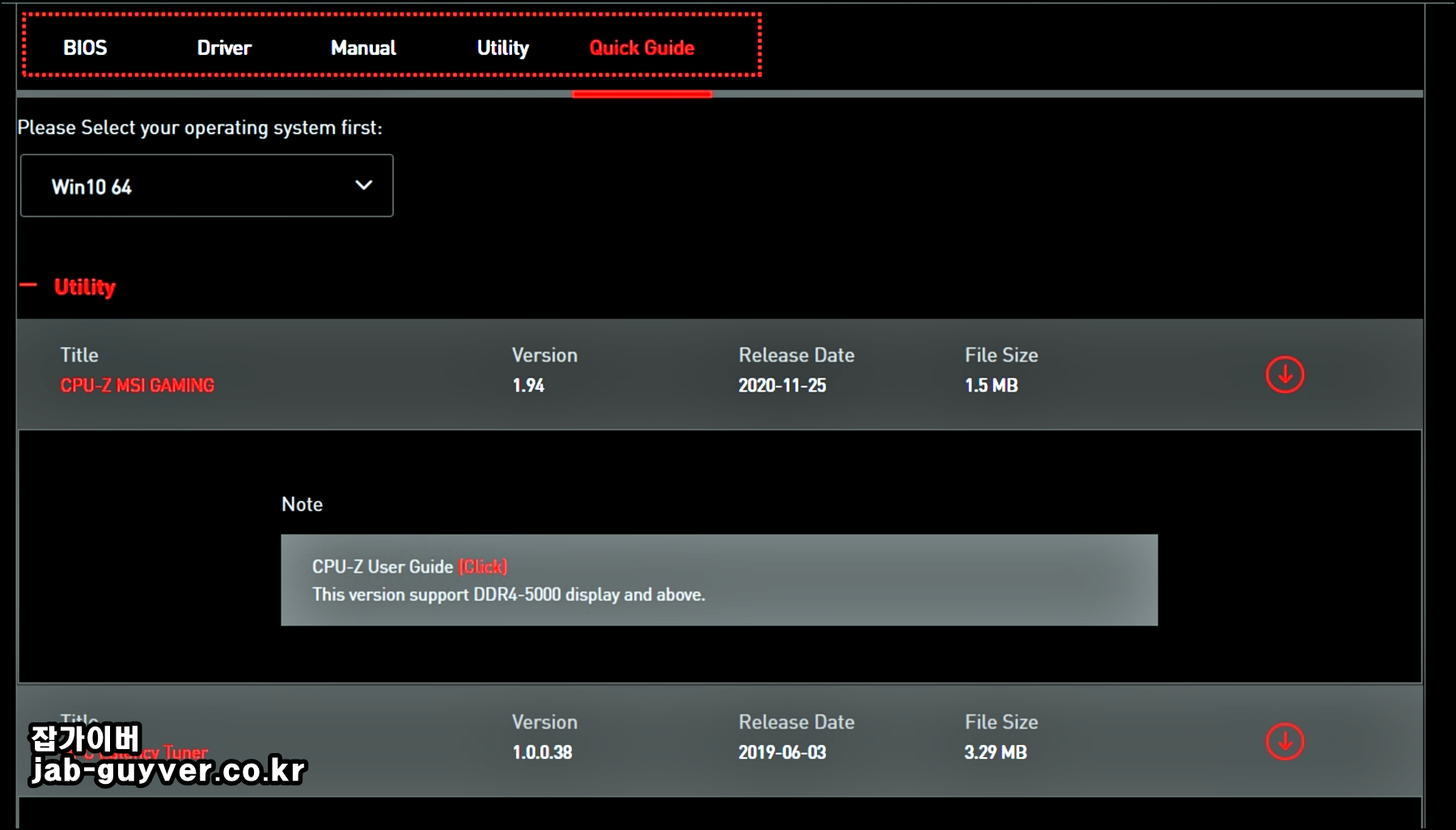 해당 MSI 메인보드 바이오스는 윈도 10 운영체제에서만 지원되며 버전을 확인 후 다운로드합니다.