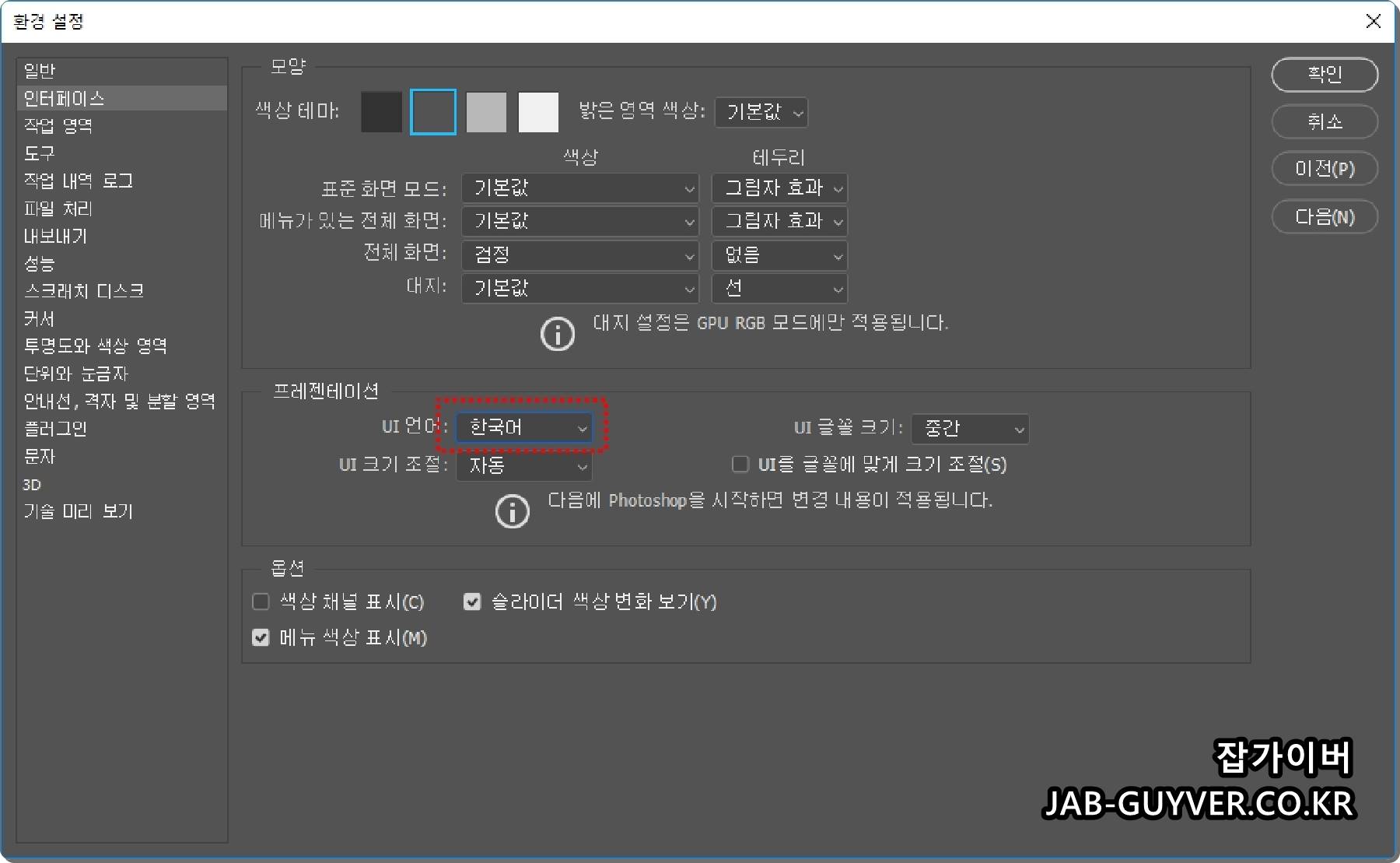 인터페이스 -> 프레젠테이션에서 UI언어를 한국어, 영어, 중국어 등 다양한 언어로 변경할 수 있습니다.