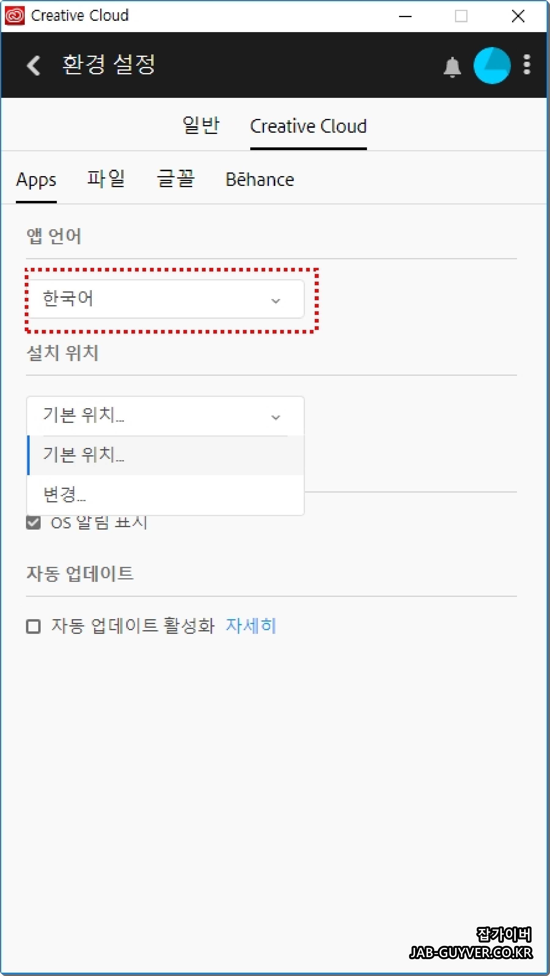 정품 소프트웨어 사용자라면 기본 설치 시 자동으로 언어 파일이 설치되며, 언어 변경이 필요한 경우 정식 경로를 통해 Creative Cloud 설정으로 변경해야 합니다.