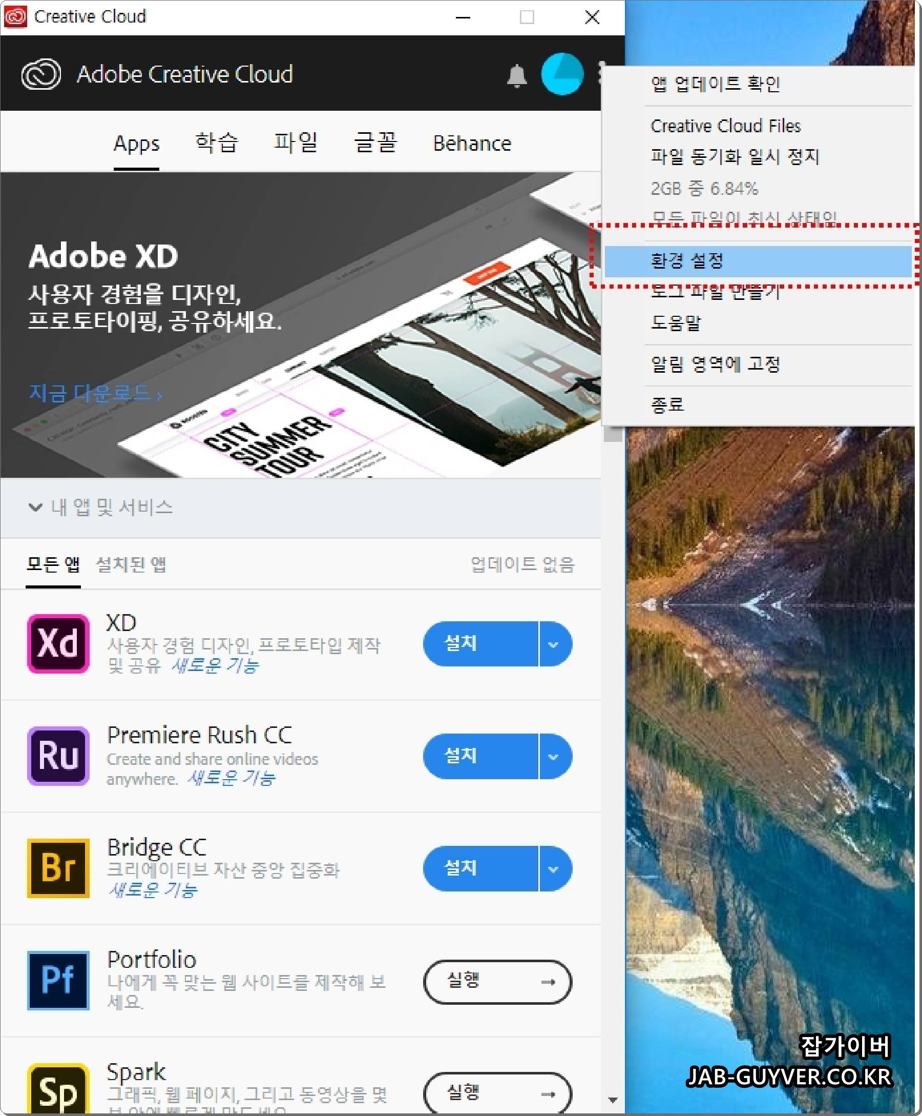 Creative Cloud 실행 후 환경설정으로 들어갑니다.