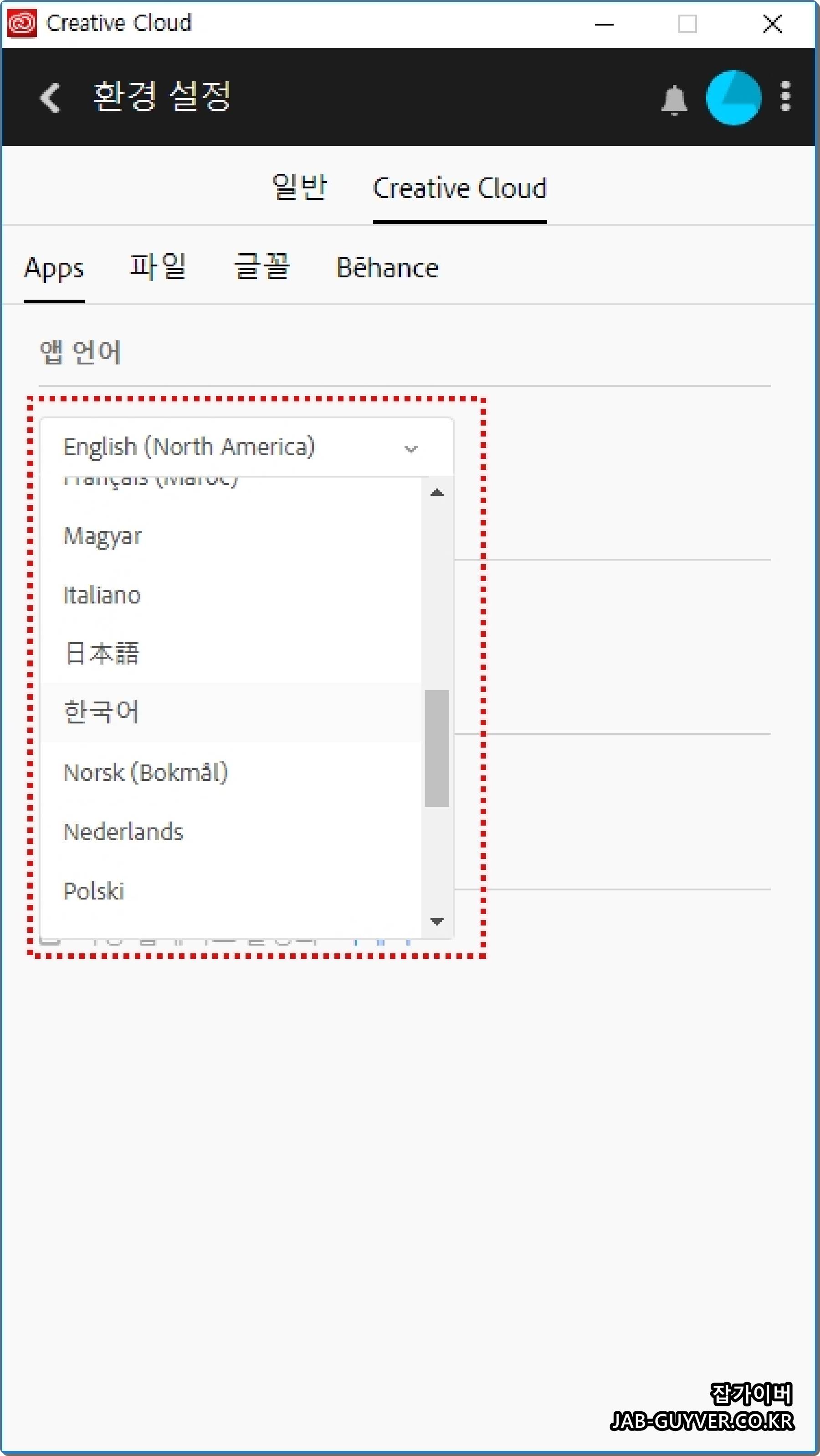 Creative Cloud -> App 이동 후 앱 언어를 English - 한국어로 변경합니다.