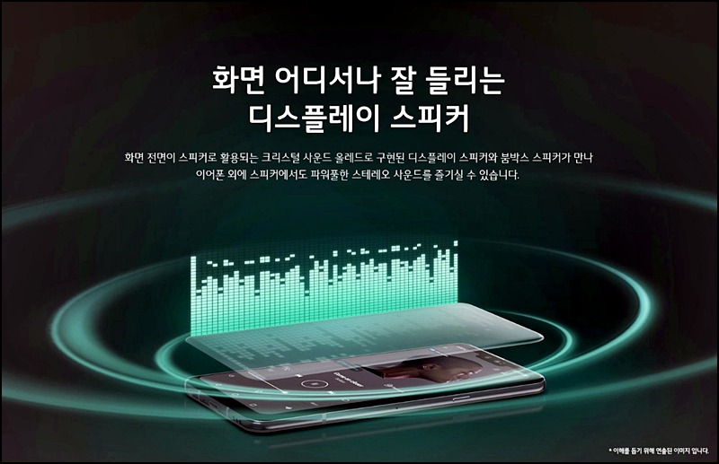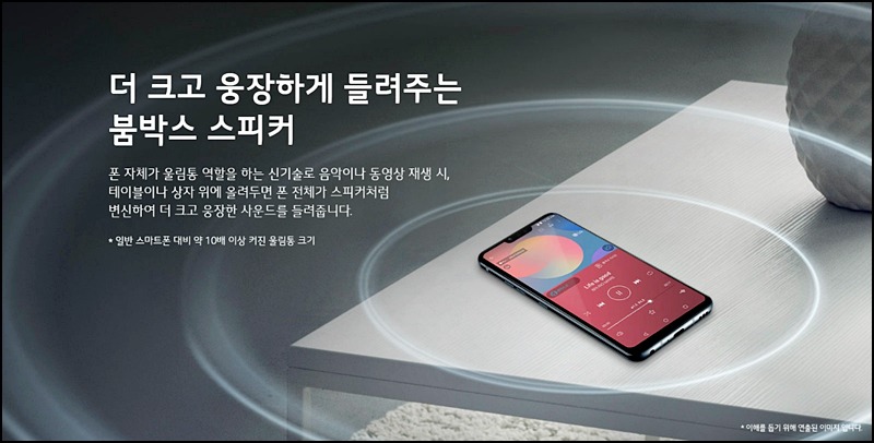 스피커가 따로 없기 때문에 전면 화면을 활용한 더욱 웅장한 카메라를 선사하며 폰 자체에서 울림통 역할을 하는 신기술로서 음악이나 동영상 재생 시 테이블이나 상자 위에 올려놓으면 그 성능은 더 배가 됩니다.