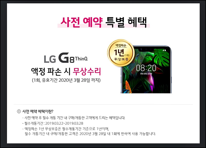 - LG G8 사전예약 혜택 신청기간 : 2019년 3월 22일 ~ 4월 30일