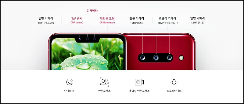 요즘 핸드폰에서 카메라 성능을 뺄 수 없는 부분으로 LG G8의 카메라는 셀피 카메라에 일반 카메라와 Z카메라로 두 개가 탑재되어 있으며 Tof 센서와 적외선 조명이 탑재되어 있습니다.