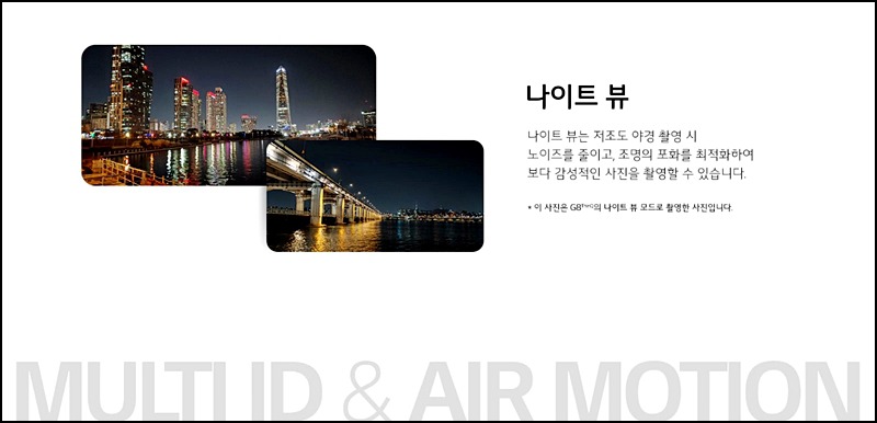 야간에는 나이트 뷰 기능으로 저조도 야경 촬영이 가능하며 야경 촬영 시 증가하는 노이즈를 줄이고 조명을 최적화여 보다 선명하고 감성적인 사진을 촬영할 수 있습니다.