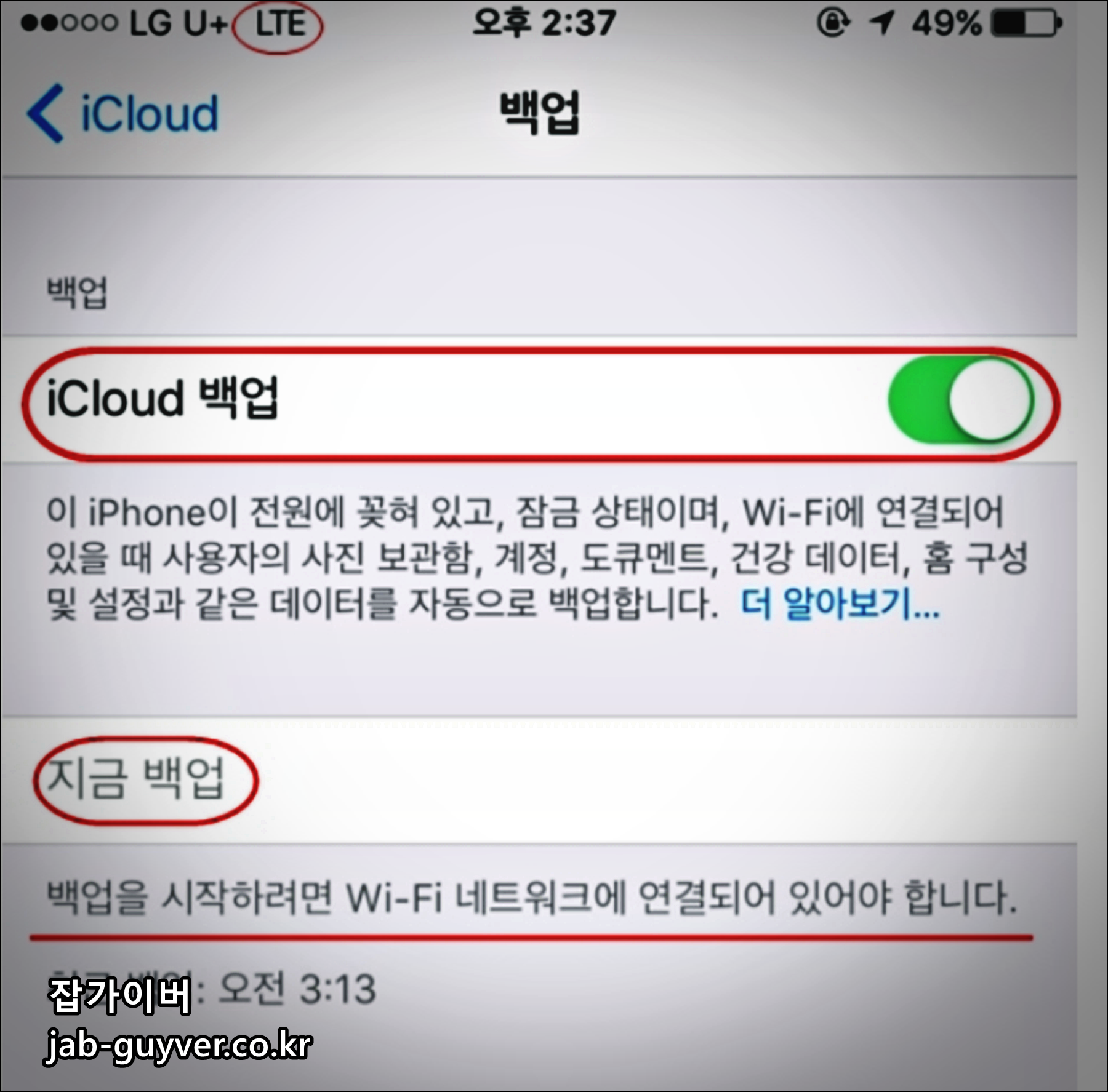 그리고 지금 바로 와이파이를 이용한 백업을 하고 싶다면 "지금 백업"버튼을 선택합니다.
