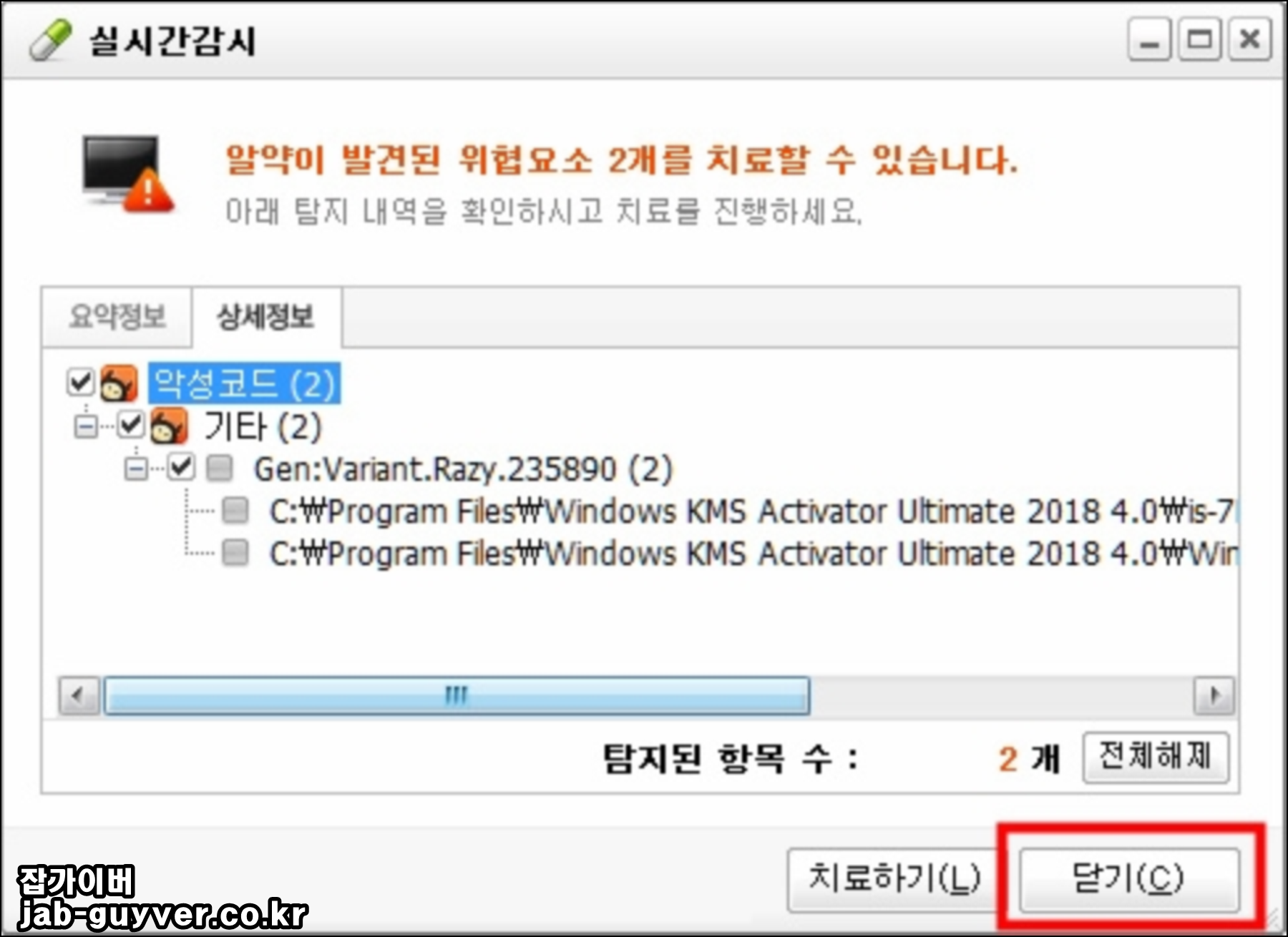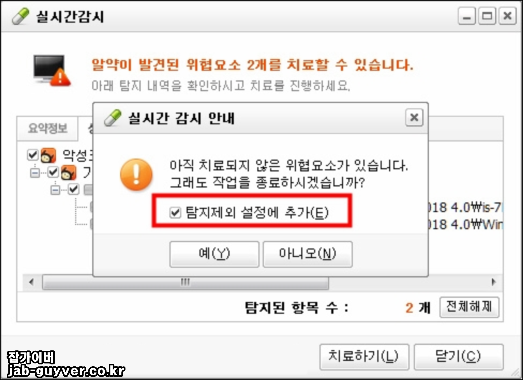 간혹 설치 중 실시간 감시로 인해 바이러스가 있다고 뜨는데 악성코드 내역을 보면 설치 중인 윈도우 KMS 파일이기 때문에 치료하기를 누르면 크랙 파일이 지워지기 때문에 닫기를 눌러준 다음 앞으로 탐지제외 설정으로 추가 후 모든 크랙 파일로 체크하는 것이 좋습니다.