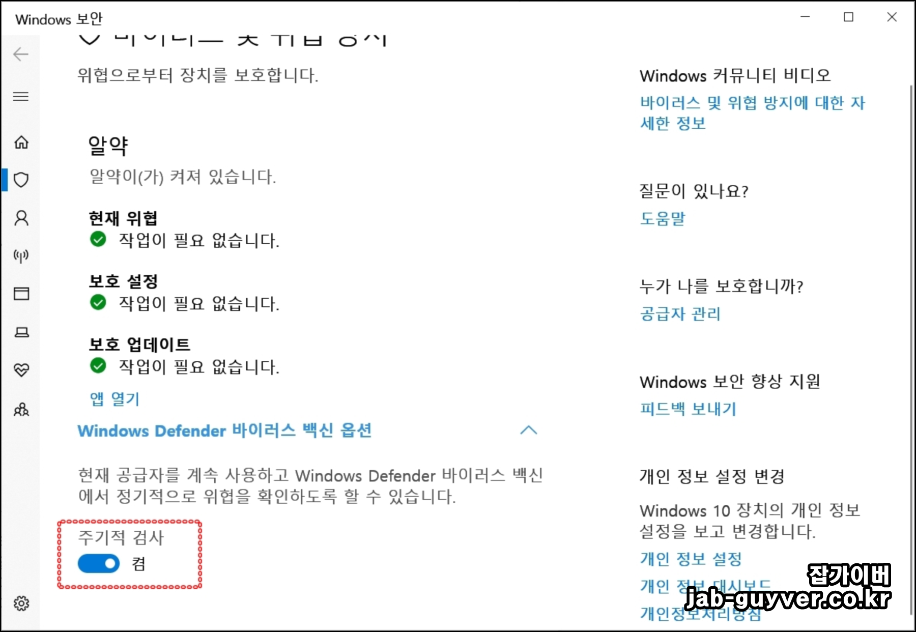Windows Defender 바이러스 백신 옵션을 선택하면 윈도우디펜더의 "주기적 검사"를 활성화하거나 비활성화할 수 있습니다.