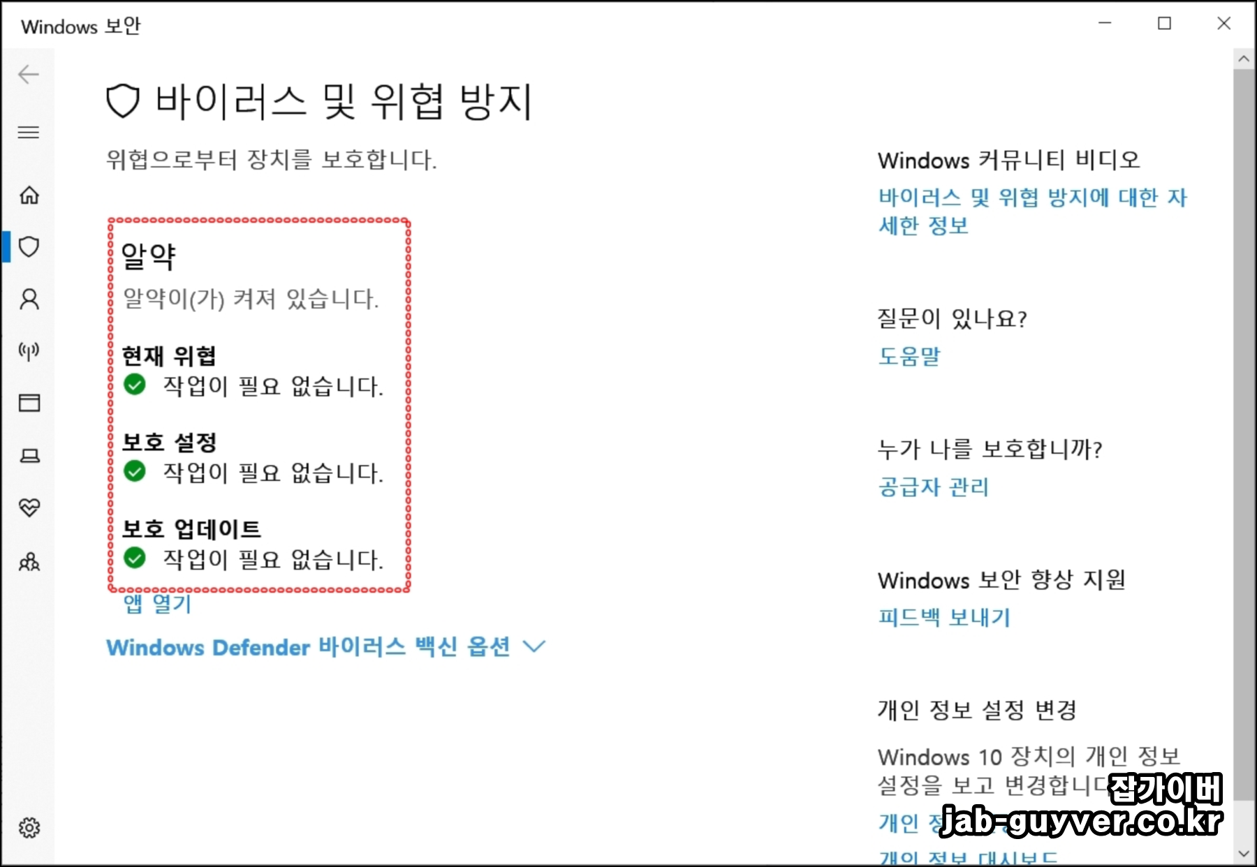 이를 통해 윈도우10 운영체제에 외부로부터 오는 바이러스나 멀웨어 등을 실시간으로 보호하는 기능을 합니다.