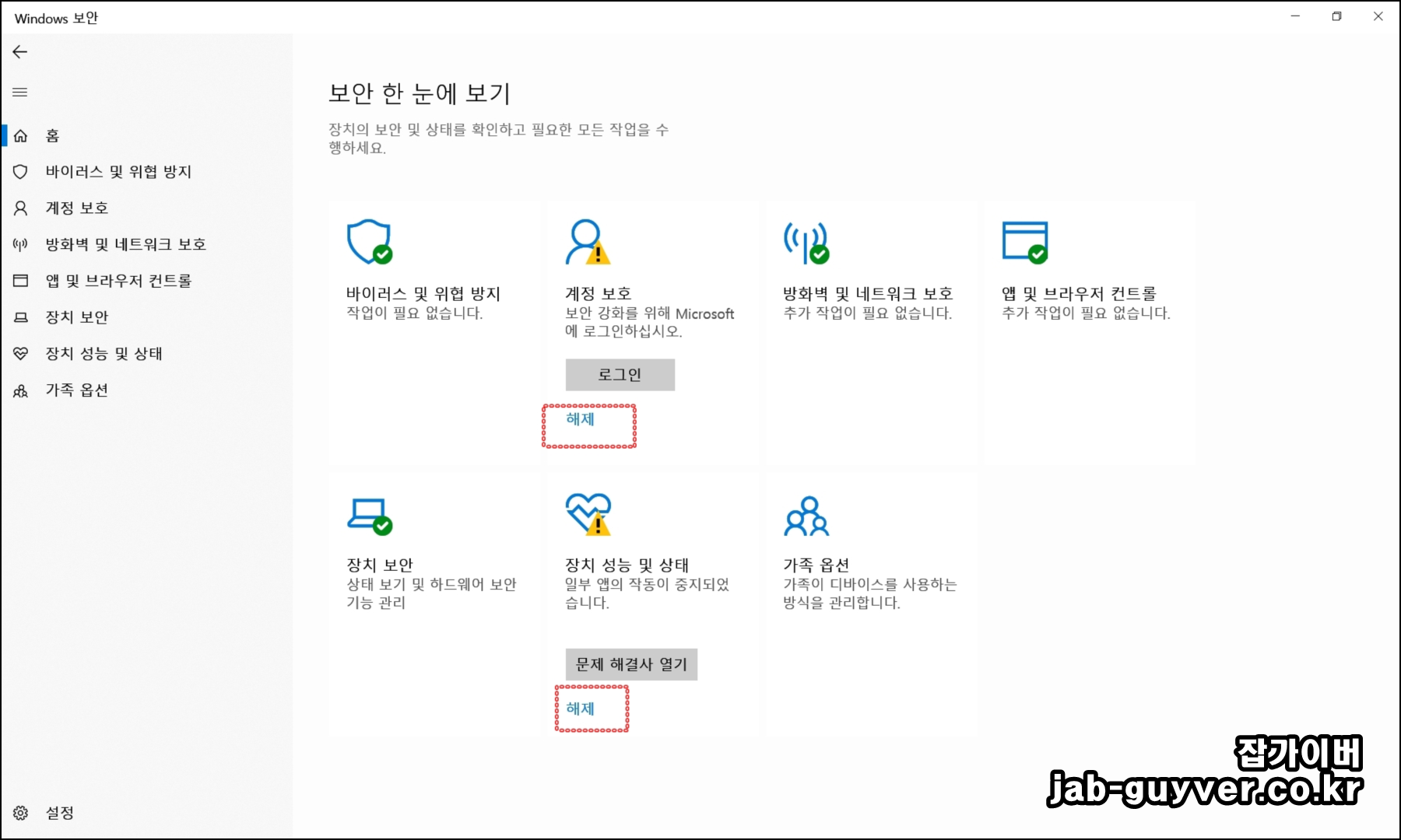 왼쪽의 메뉴 중 홈 화면을 선택하면 7가지의 보안상태를 한눈에 확인할 수 있습니다.