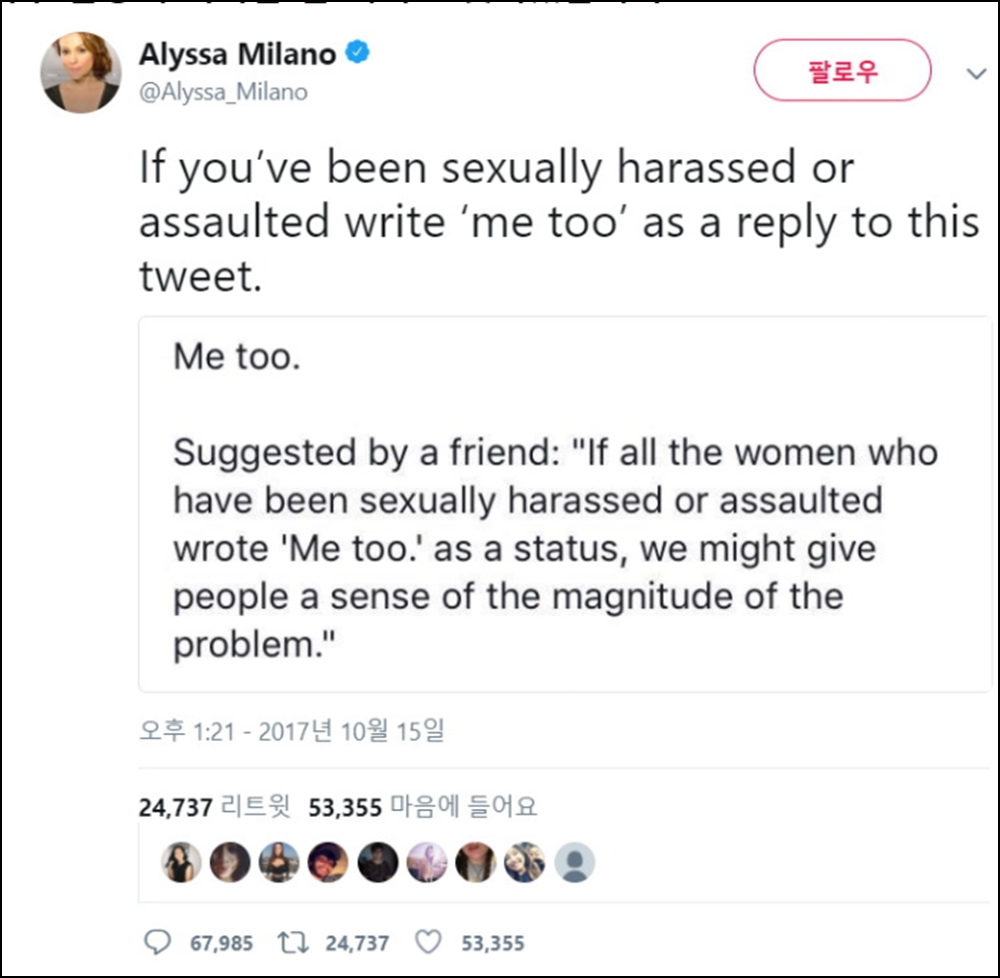 그것은 바로 미투운동을 제안하게 되는 시발점이었는데 날짜는 2017년 10월 15일이다