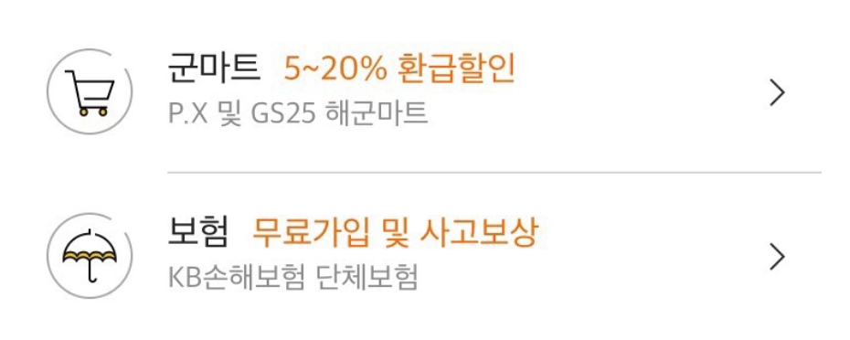 나라사랑카드는 국민은행 kb에서 나온 카드로서 국대마트인 PX 나 GS25 해군마트에서 5~20%의 할인과 함께 대중교통도 20% 청구할인이 가능하다.