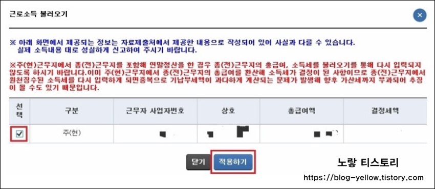 근무처별 소득명세 자료를 클릭하면 선택란에 해당 사업자 번호 상호 총급여액을 확인하고 체크 후 적용하기 눌러줍니다.