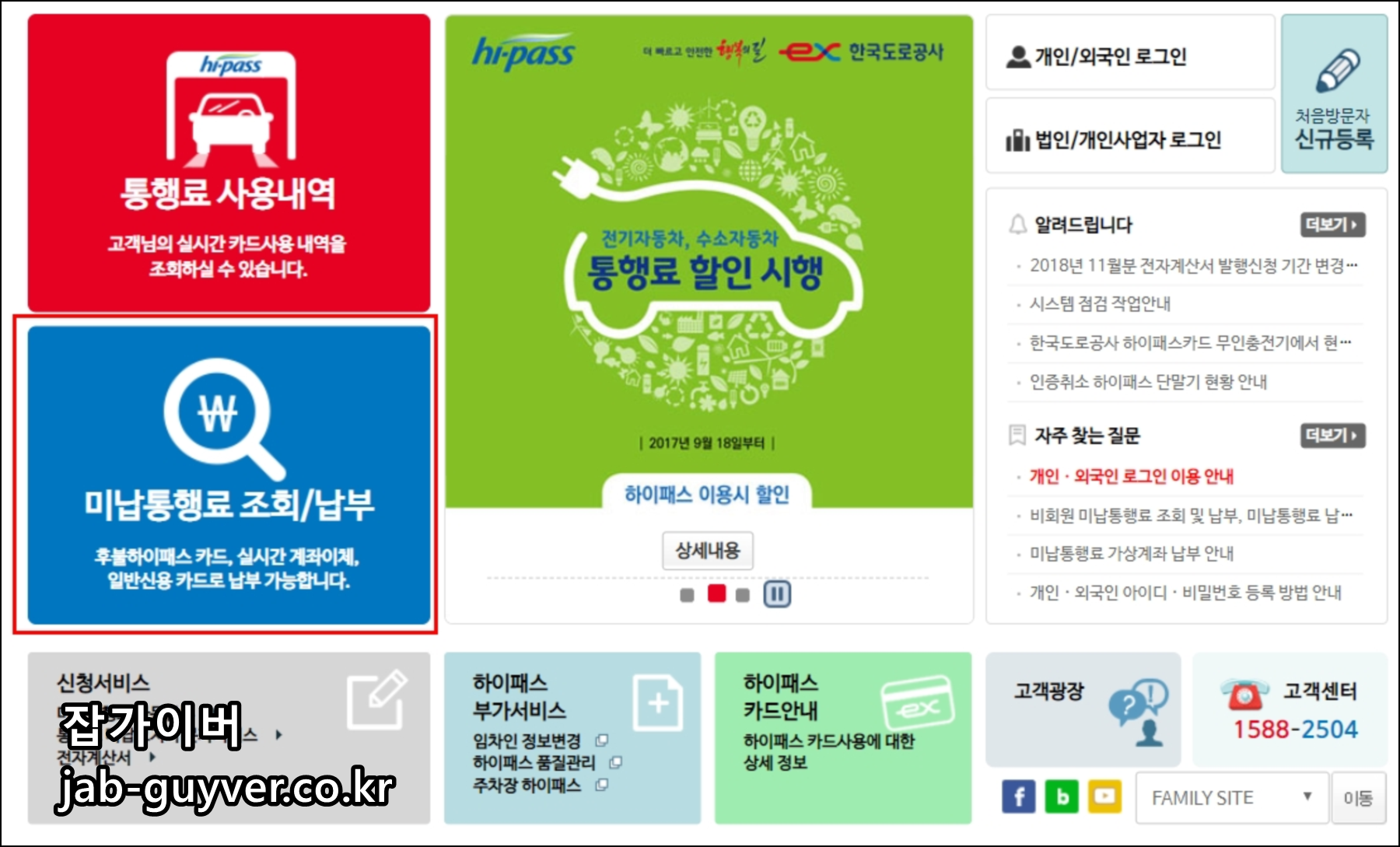 하이패스 미납요금을 납부하기 위해서는 한국도로공사에서 서비스하는 하이패스 서비스로 접속합니다.