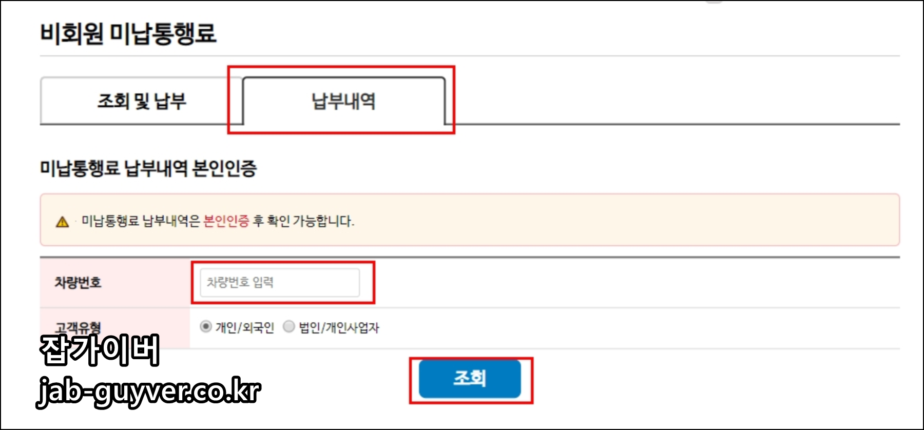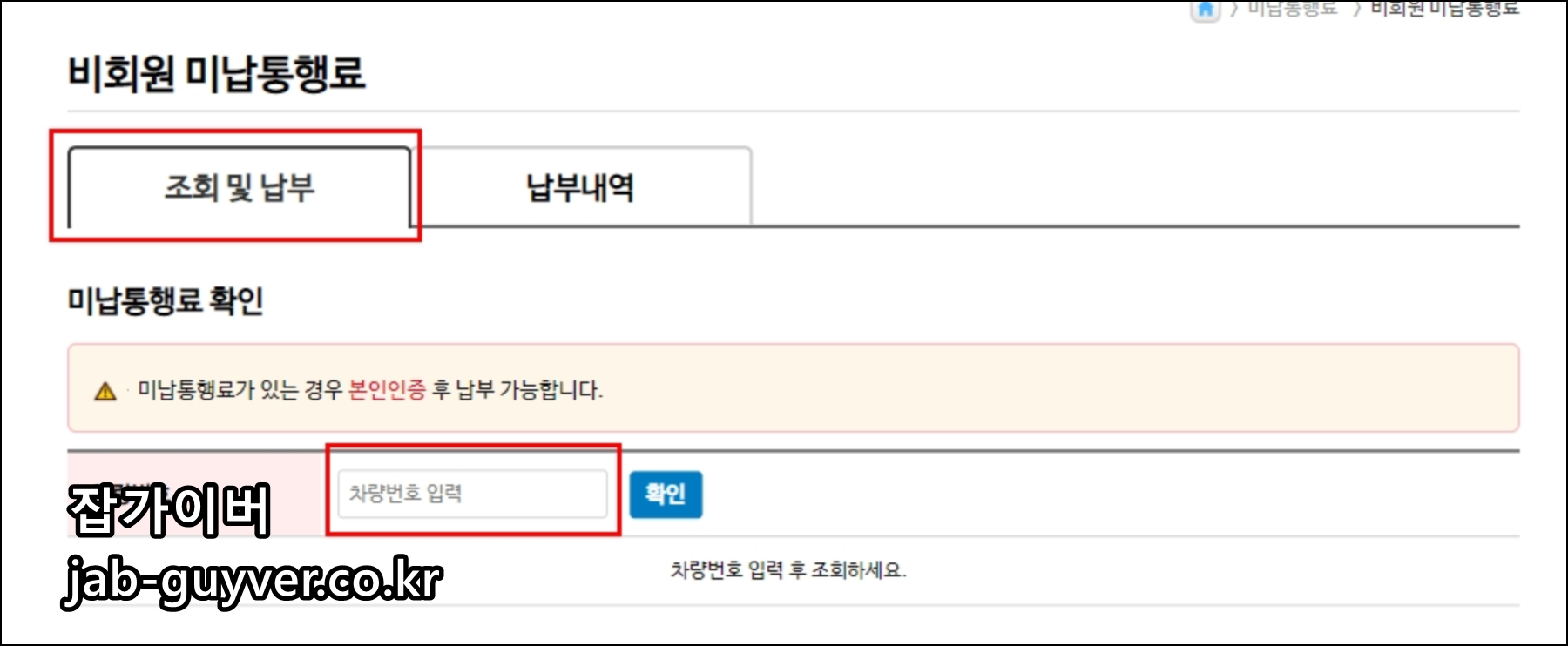 비회원으로 접속 후 자신의 차량번호를 입력하면 해당 차량번호에 대한 하이패스 미납통행료를 조회 및 납부가 가능합니다.