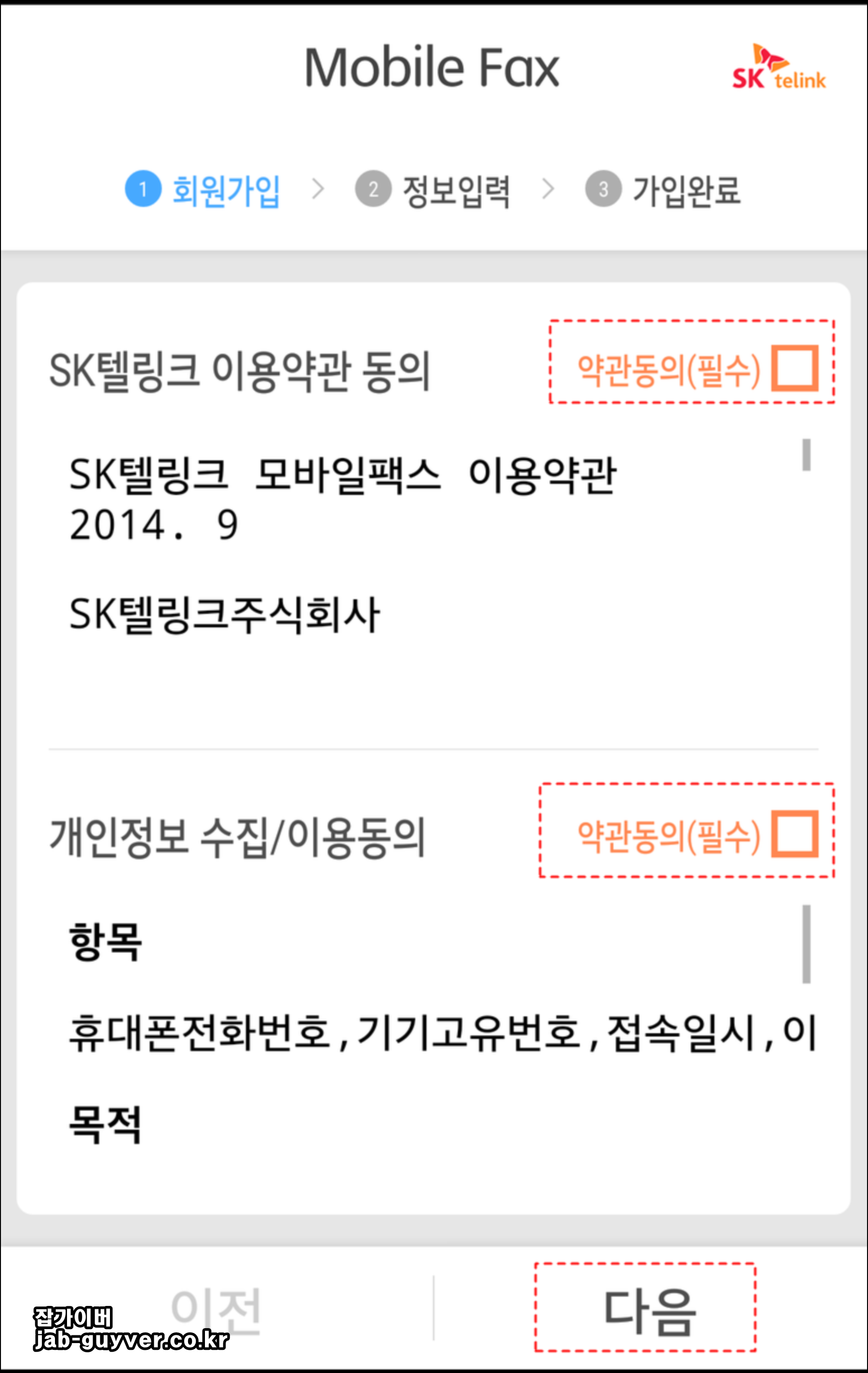 기본적인 SK텔링크에 대한 이용약관에 동의를 했는데 필수적인 부분만 체크합니다.