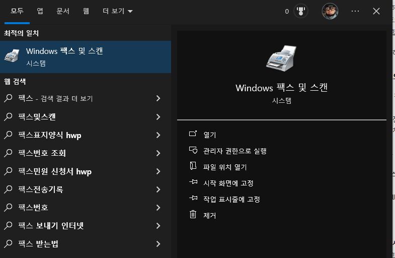 - 시작 메뉴에서 팩스와 스캔을 검색하여 실행합니다.