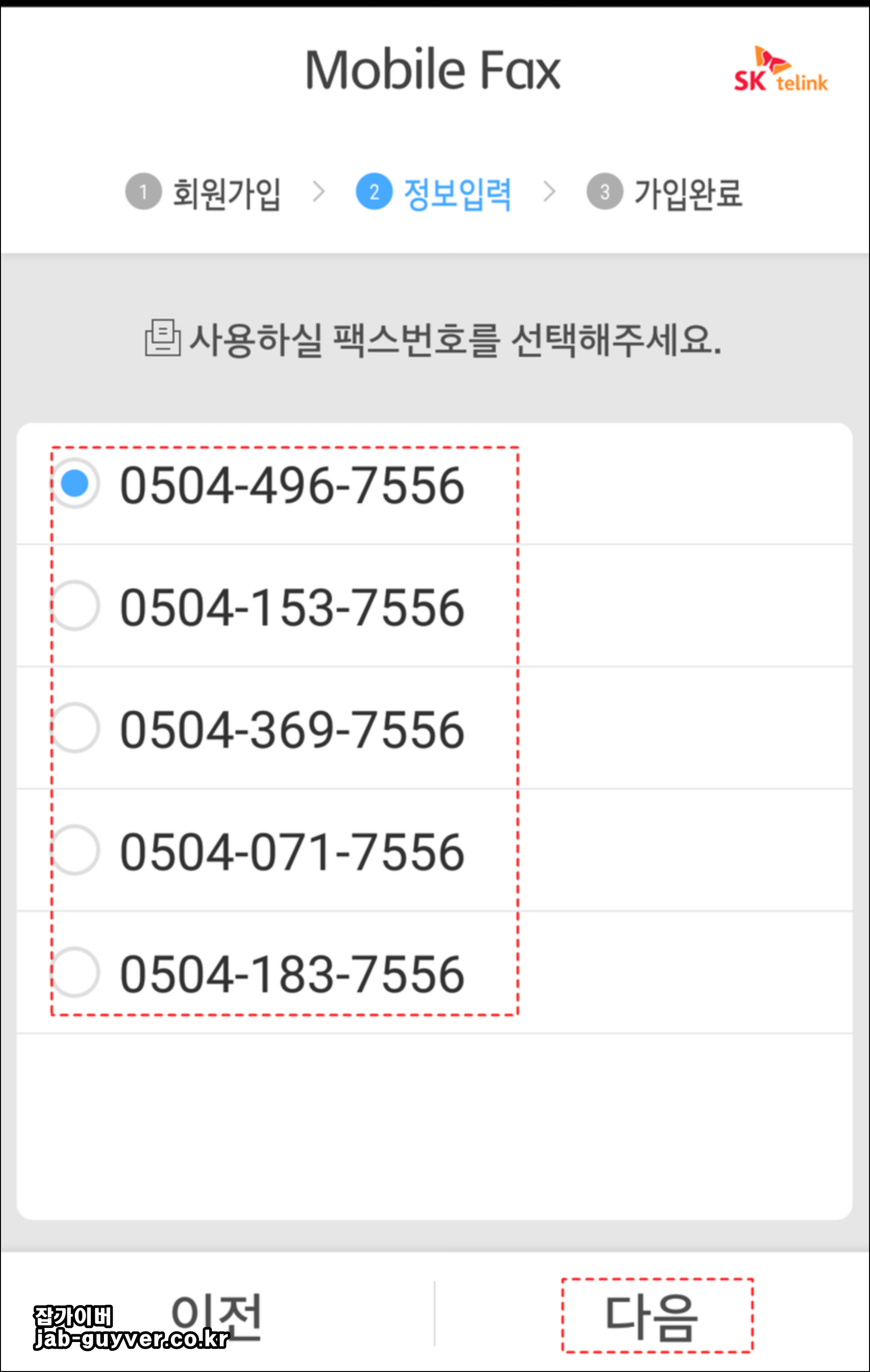 - 신규로 가입하게 되면 팩스번호가 존재하지 않기 때문에 자신의 핸드폰 번호를 기준으로 유사한 번호 조합으로 자신의 팩스번호를 선택할 수 있으며 자신이 사용하고 싶은 모바일 팩스번호를 선택합니다.