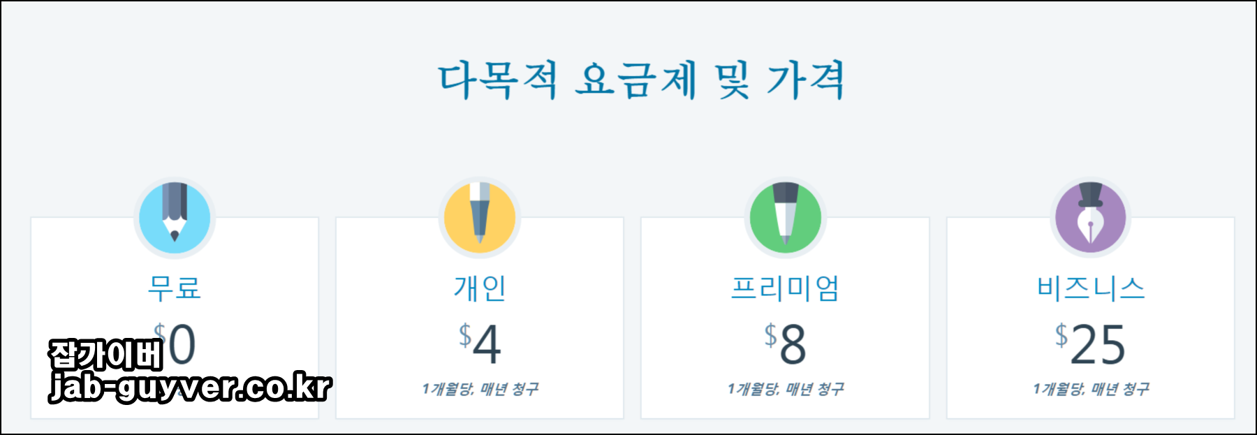 기본적으로 무료 요금제 (평생) / 개인은 한 달에 4달러 / 프리미엄은 한 달에 8달러 / 비즈니스는 25달러의 요금제가 있습니다.