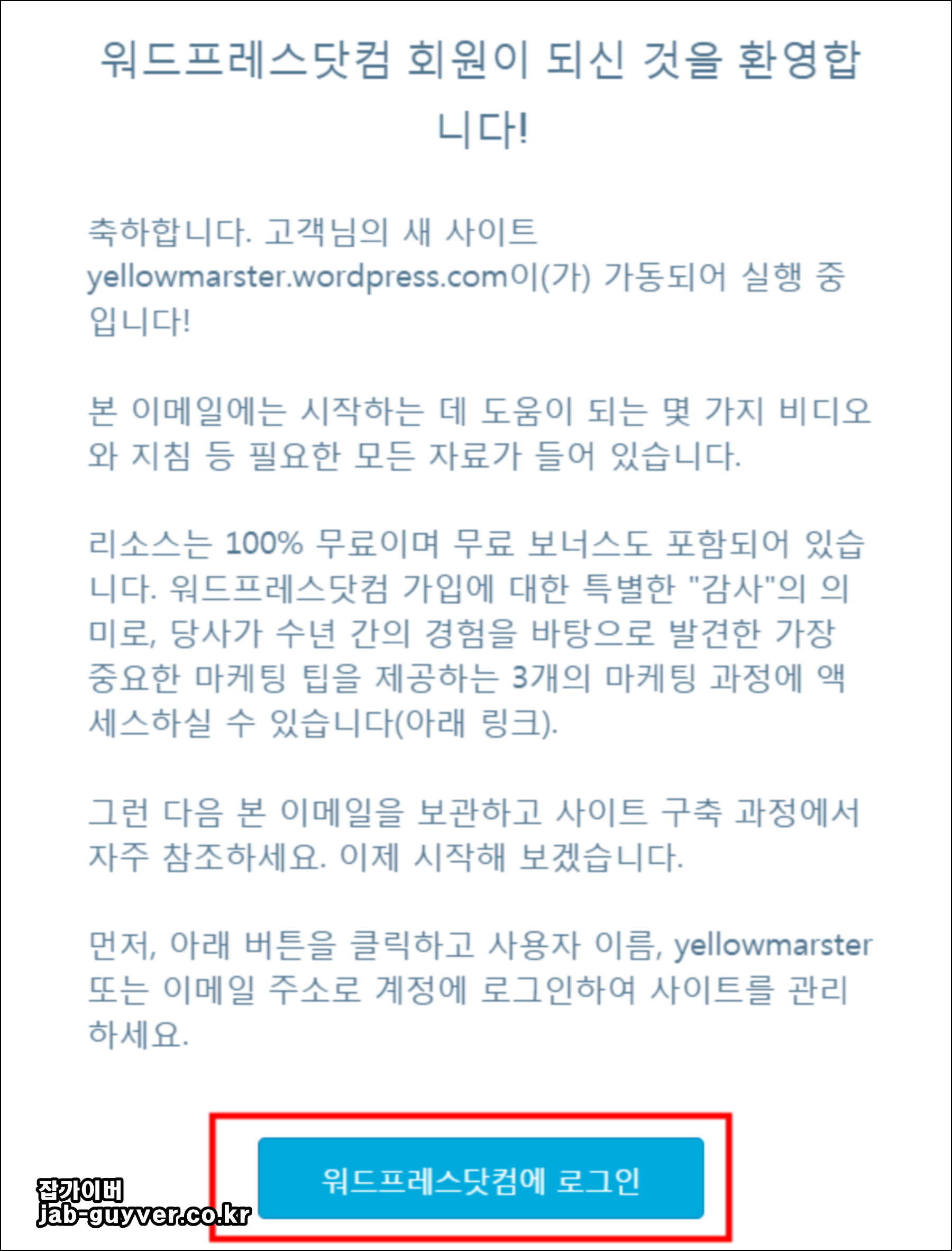 - 가입 승인 및 확인 이메일: 가입 신청 후, 사용자가 입력한 이메일 주소로 확인 이메일이 전송됩니다. 이 이메일을 확인하면 자신의 워드프레스 닷컴으로 접속이 가능해집니다. 이는 가입자의 식별 및 보안을 위한 중요한 단계로, 가입 프로세스를 완료합니다.