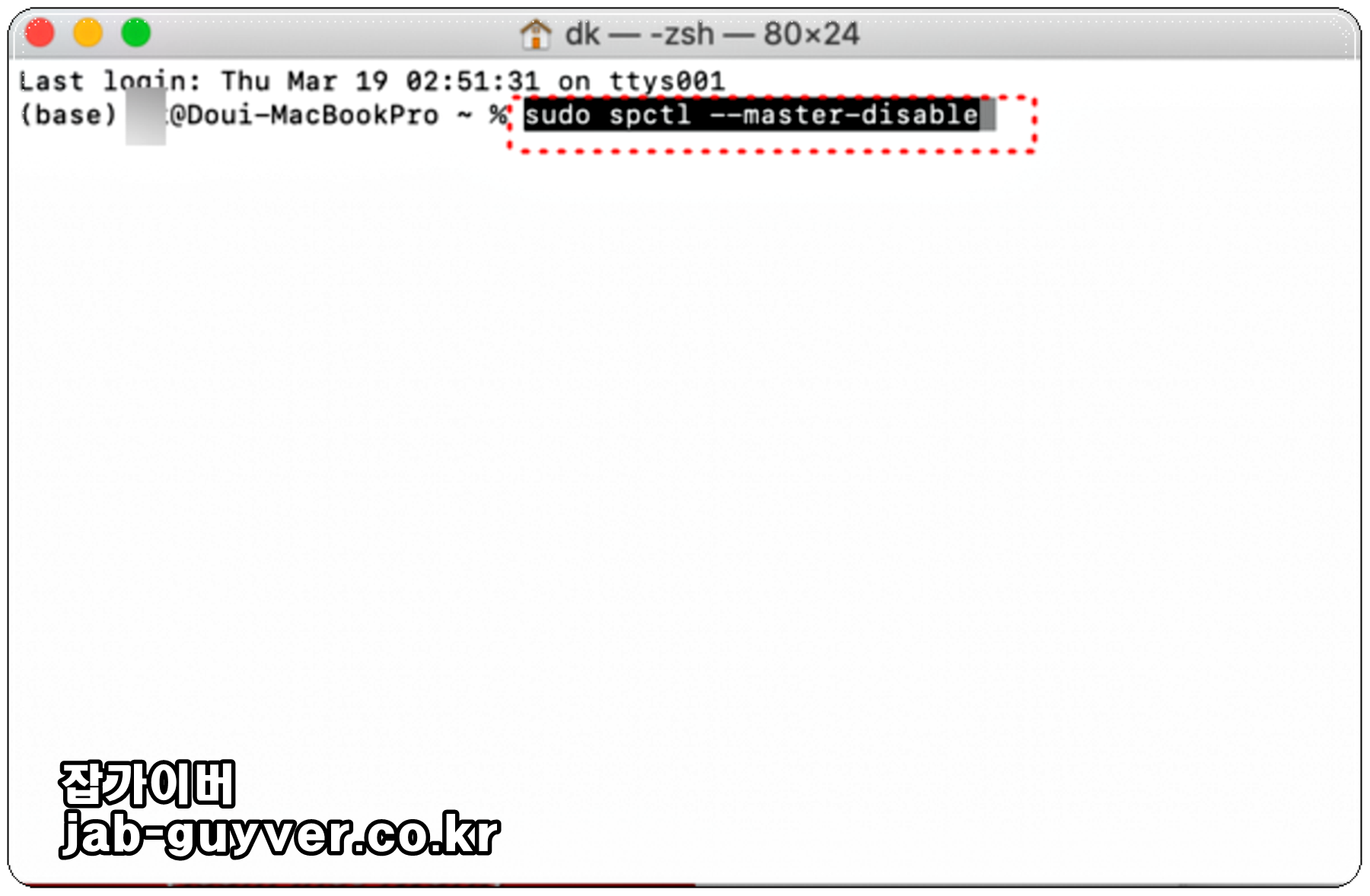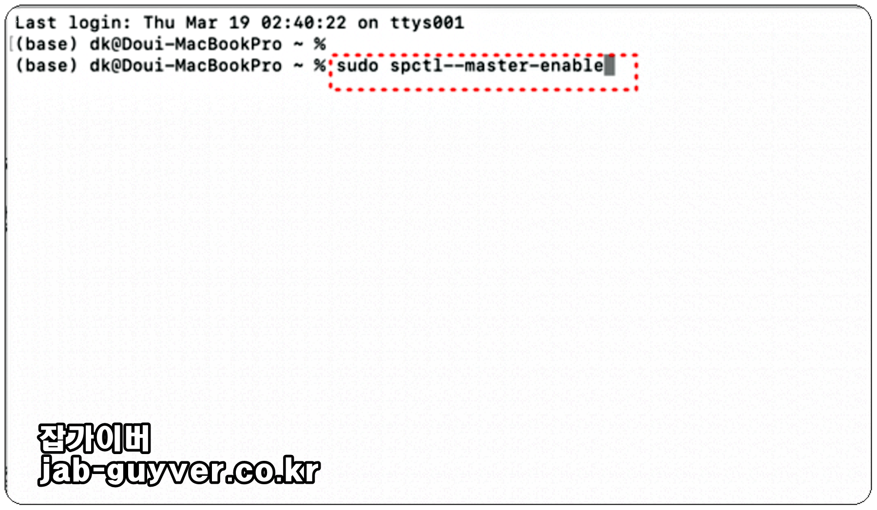 반대로 마스터 활성화를 위해서는 터미널을 실행 후 위 명령어를 입력하면 GateKeeper 활성화가됩니다.